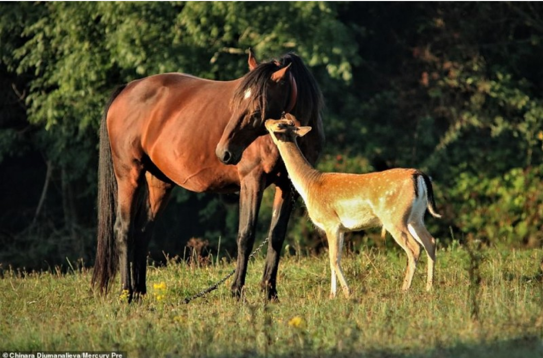 Эти трогательные фотографии дружбы оленя и лошадей сделала Чинара Джуманалиева, которая посещала пастбище несколько дней подряд. По ее словам лошадь обнималась с олененком, ухаживала за ним и даже чистила его как своего жеребенка.