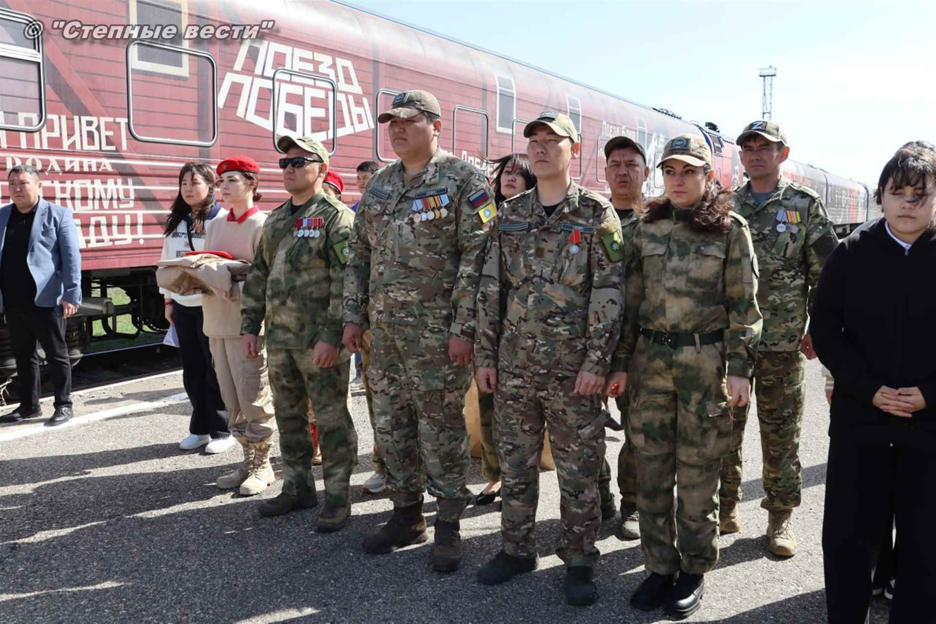 В Элисте «Поезд Победы» торжественно встречали представители руководства республики, общественных, ветеранских и молодежных организаций региона, курсанты центра «Воин» и их инструкторы – участники СВО. На перроне железнодорожного вокзала выстроились «Орлята России», «Движение Первых», «Юнармия», студенческие отряды и волонтерские движения.