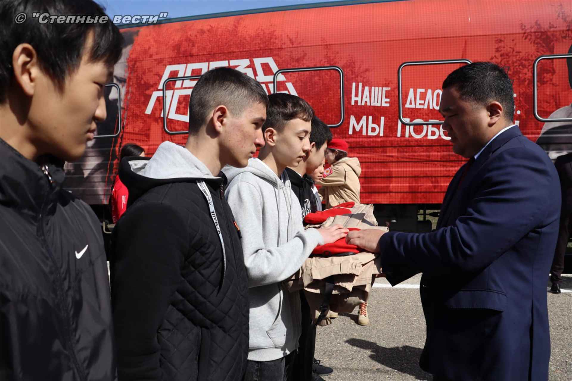 У «Поезда Победы» состоялась и церемония посвящения школьников в ряды всероссийского детско-юношеского военно-патриотического общественного движения «Юнармия». Учащиеся элистинской школы №18 им. Б.Б. Городовикова и Ики-Чоносовской школы им. С.О. Дорджиева торжественно принесли присягу и получили новую форму. Затем участники митинга посетили экспозицию передвижного музея.