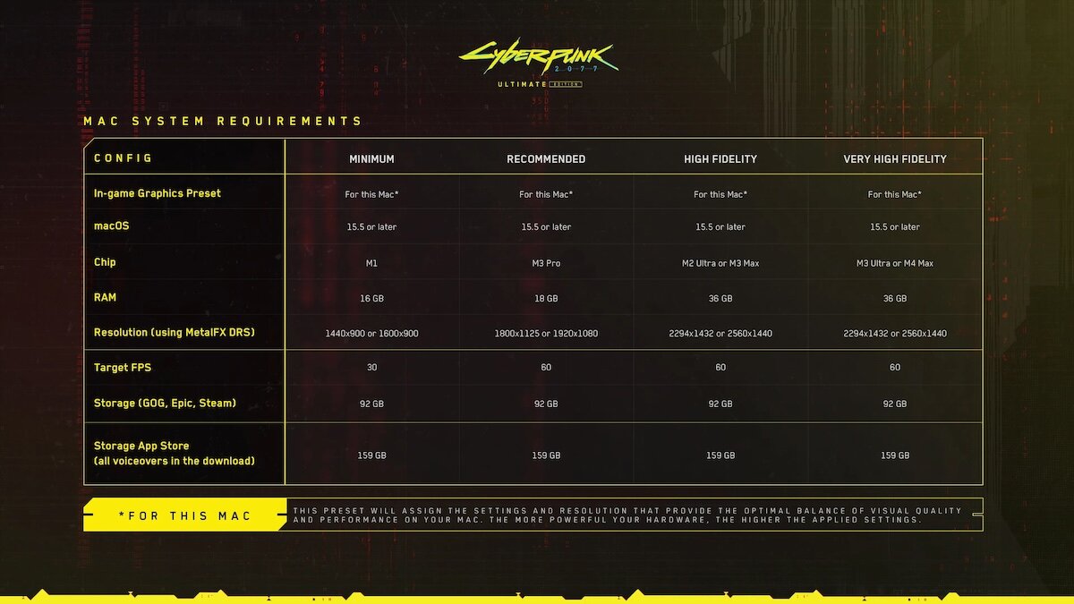 Если же геймеру хочется получить более плавную картинку, то CD Projekt Red рекомендует запускать ролевую игру на процессоре M3 Pro (или мощнее) с 18 ГБ унифицированной памяти. В данном сценарии игра будет работать при разрешении 1800х1125 или 1920х1080 пикселей (тоже благодаря апскейлу MetalFX DRS) на 60 FPS. Две остальные конфигурации графики High Fidelity и Very High Fidelity нацелены на владельцев крайне производительных компьютеров Mac. Например, для High Fidelity необходимо иметь чип M2 Ultra или M3 Max с 36 ГБ унифицированной памяти — это позволит получить 60 FPS при высоких настройках графики в разрешении 1440р (с апскейлом).