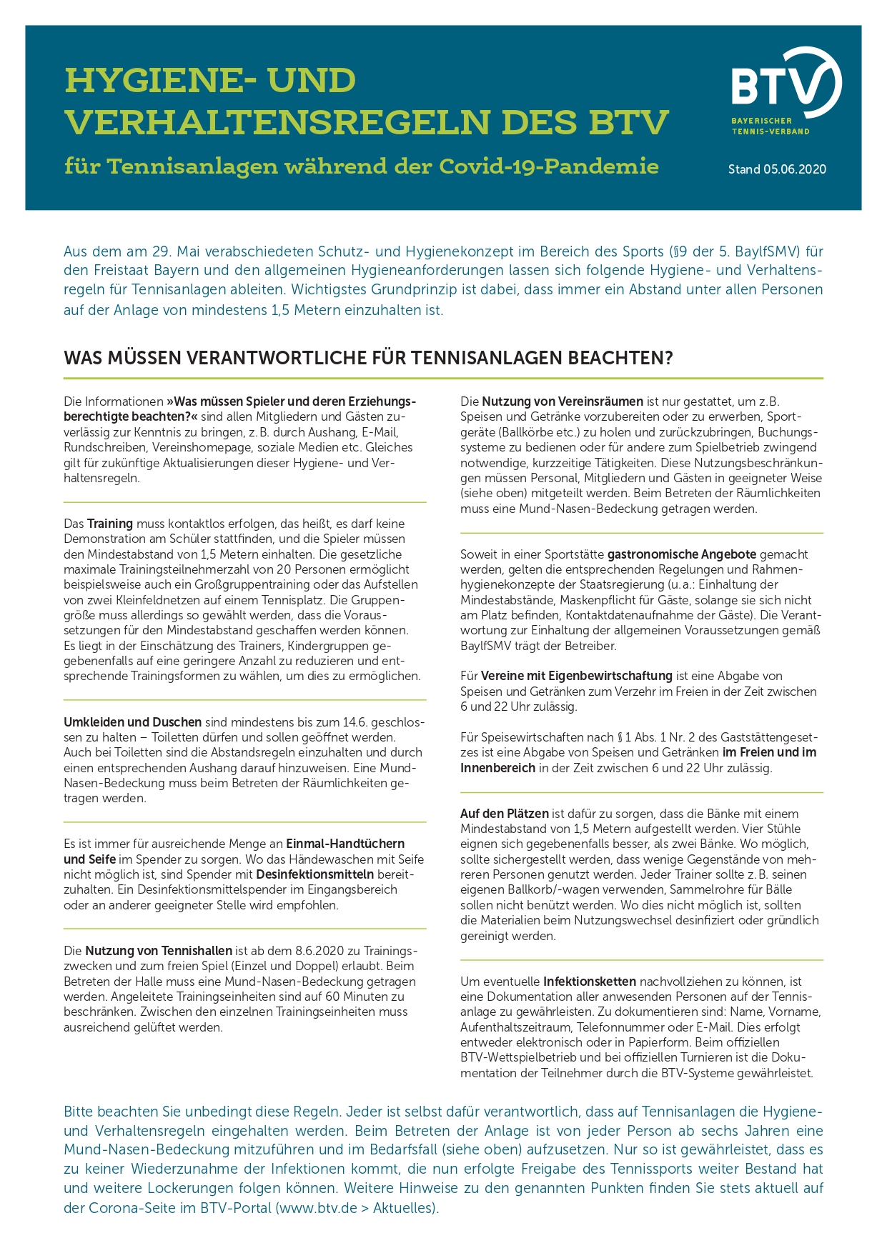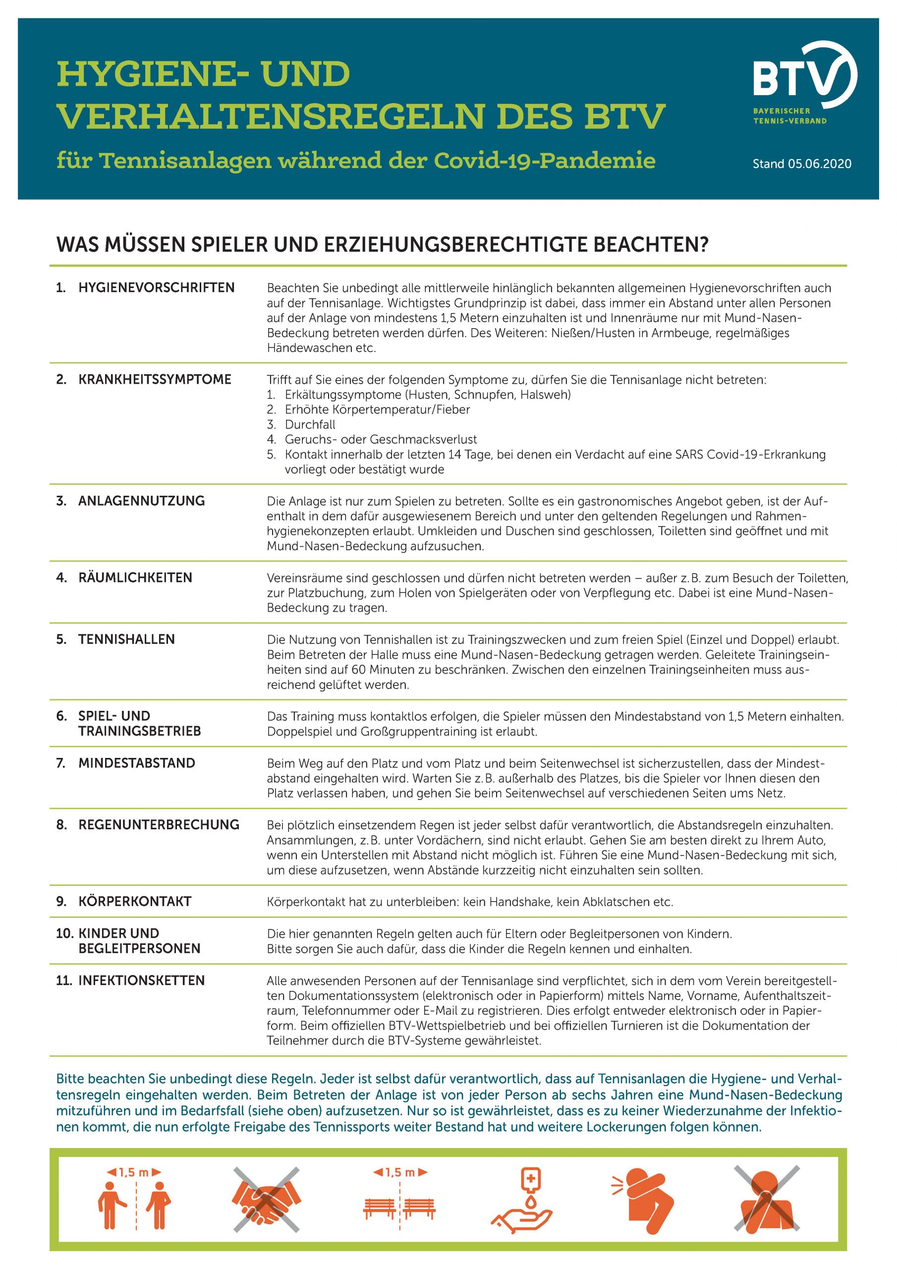 Ab Montag, den 8.6.2020 erlauben uns die Lockerungen im Rahmen der Corona-Maßnahmen, dass wir die Halle wieder nutzen dürfen. Auch hier gilt, dass die Plätze nur online über unser Buchungssystem gebucht werden können, maximal 6 Stunden im Voraus und jeweils nur für 1,5 Stunden. Bitte verlassen Sie auch hier Ihren Platz nach ca. 1 Stunde und 15 Minuten, um eine Begegnung mit den nachfolgenden Spielern zu vermeiden. Genauso gilt es auch in der Halle, den Mindestabstand von 1,5 m zu jeder Zeit einzuhalten und das Spielen kontaktlos auszuüben. Das Betreten der Halle ist nur den Spielern und Trainern erlaubt! Die Kinder werden an der Hallentür abgegeben und abgeholt! Das Zuschauen in der Halle ist nicht erlaubt! Beim Betreten und Verlassen der Halle gilt die Maskenpflicht bis Sie auf Ihrem vorgebuchten Platz sind, genauso auch beim Gang auf die Toiletten im Garderobenhaus, die wieder geöffnet sein werden. Die Garderoben müssen weiterhin geschlossen bleiben. Bitte beachten Sie, dass die Halle unter keinen Umständen mit Sandplatzschuhen bespielt und betreten werden darf.