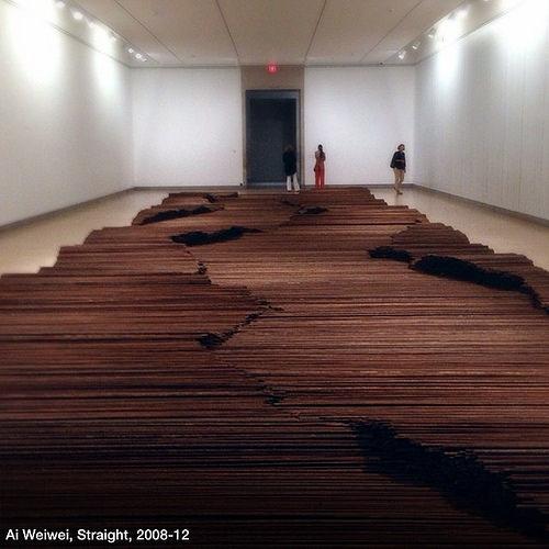 Umělcem se narodil a disidentem se stal nejen pro složité dětství, kdy jeho otec byl „exulantem“ ve své vlastní zemi, ale pro své nekompromisní postoje po katastrofálním kolapsu budov a ztrát na životech při zemětřesení v roce 2008 v čínské provincii Sečuán (S'-čchuan, Sichuan). V atmosféře korupce, kterou tak dobře známe, byly stavby předraženy a ošizeny, bez ohledu na bezpečnost lidských bytostí. Odhaduje se, že zemřelo na 80 000 lidí a z toho 5 000 školáků. V reakci na odmítnutí úřadů zveřejnit jakékoli informace provedl Aj Wej-wej vlastní vyšetřování a vytvořil zobrazenou skulpturu. Z trosek vytahané dráty z ošizeného železobetonu leží jako by v pokojném obraze krajiny, říčního koryta, peripetii životů. Tímto způsobem zaznamenal a připomíná nám neustále smrt nevinných.