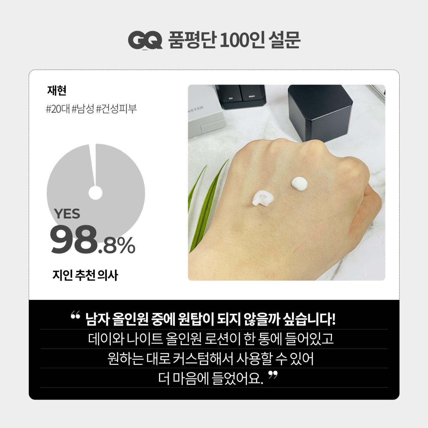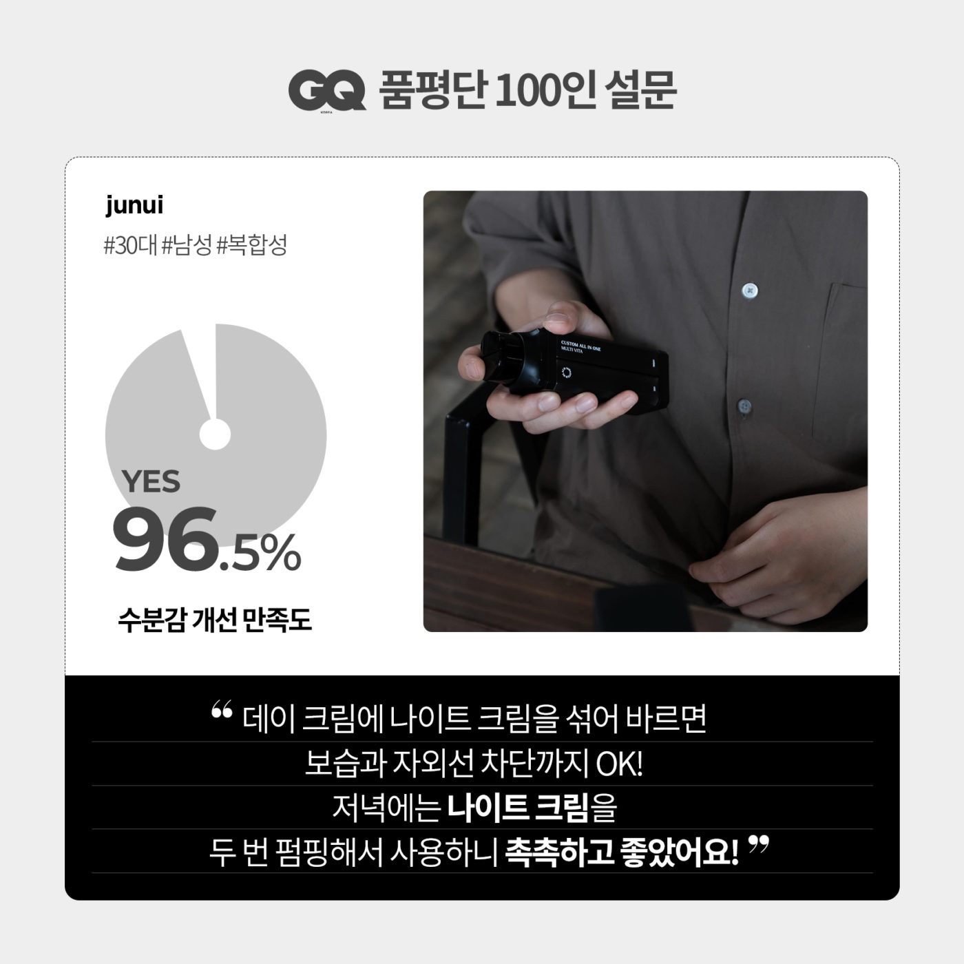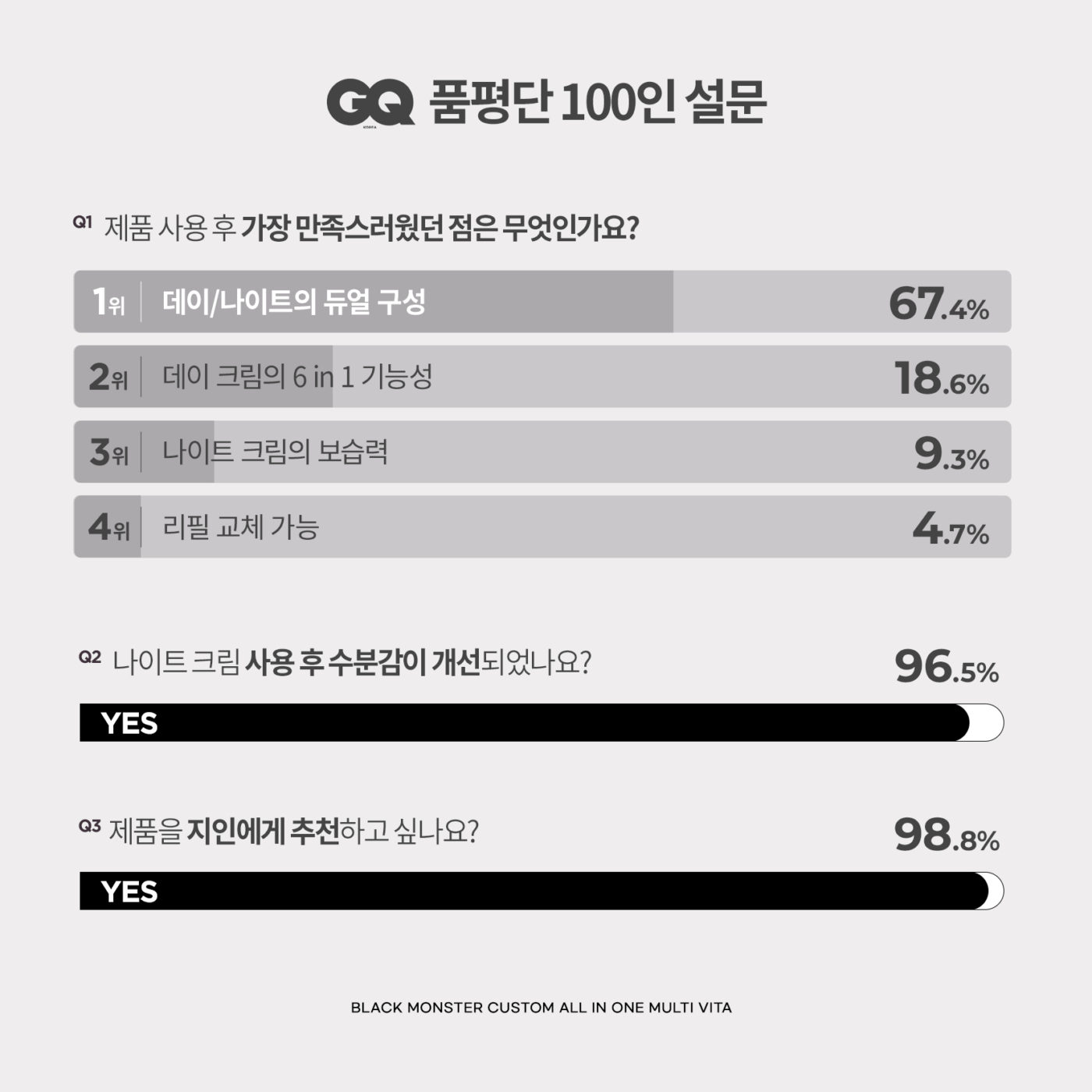 이제 올인원 제품도 피부 컨디션에 따라 선택하세요. ‘블랙몬스터’의 ‘커스텀 올인원 멀티비타’는 피부 타입에 따라 골라 쓰는 나이트 크림과낮 동안 필요한 케어를 모두 담은 데이 크림으로 이루어져 있습니다. ‘올인원 멀티비타’를 체험해본 <지큐품평단 100명의 지인 추천 의사는 98.8%였죠촉촉함과 생기를 부여하는 올인원에 대한 자세한 후기는 카드 뉴스로 확인해보시길.