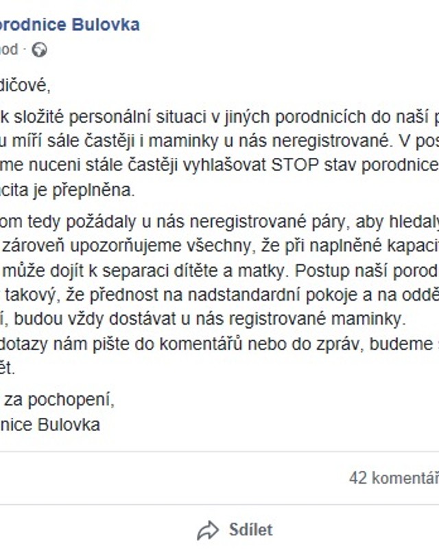 Porodníci z pražské Fakultní nemocnice Bulovka v pátek prostřednictví svého facebookového profilu vyhlásili stop stav. Důvodem jsou přeplněné kapacity porodnice.