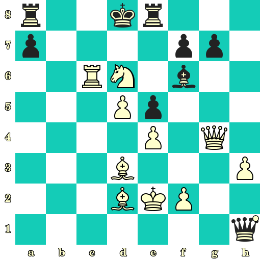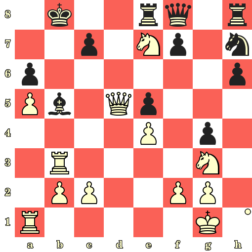 Échec et mat en 4 coups : 1. Txb5+ axb5 2. Dxb5+ Ra7 (ou 2...Ra8 3.Da6+ Rb8 4.Cc6#) 3. Cc6+ Ra8 4. Da6#