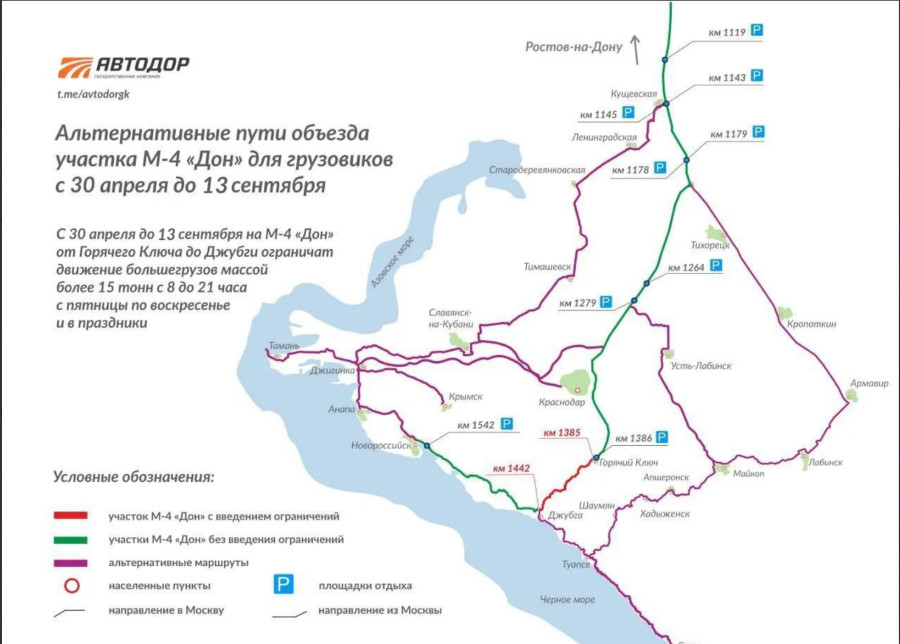 В Краснодарском крае на участке трассы М-4 «Дон» ограничат проезд грузовиков