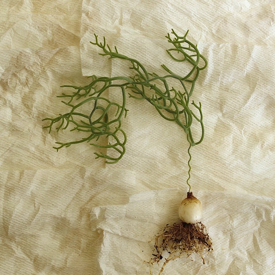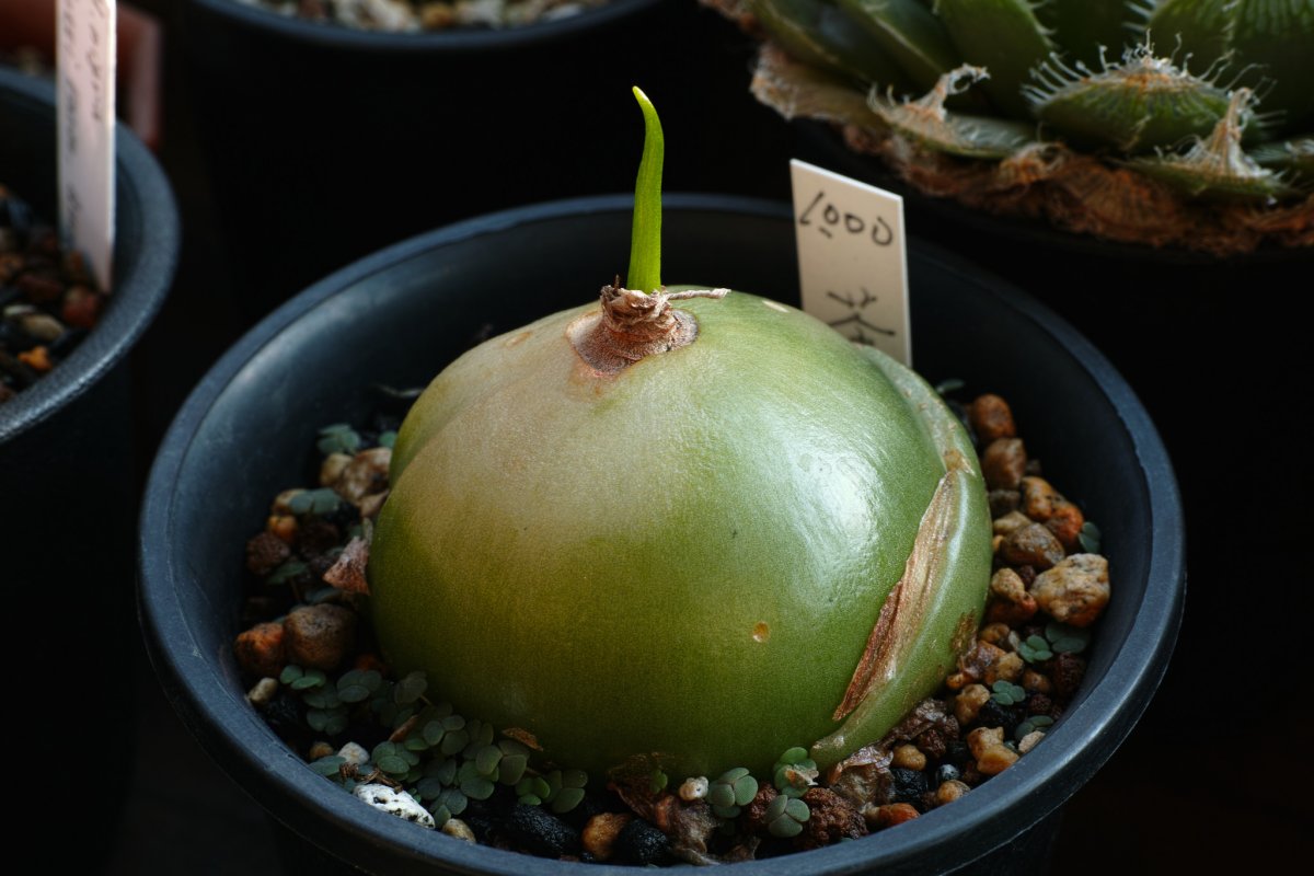 При первом взгляде луковицы напоминают репу или гигантский зеленый редис. Луковицы светло-зеленые, с защитными сухими чешуйками, слегка плосковидные, постоянно растут и у взрослых растений не ограничиваются 30 см диаметра при вдвое меньшей высоте.