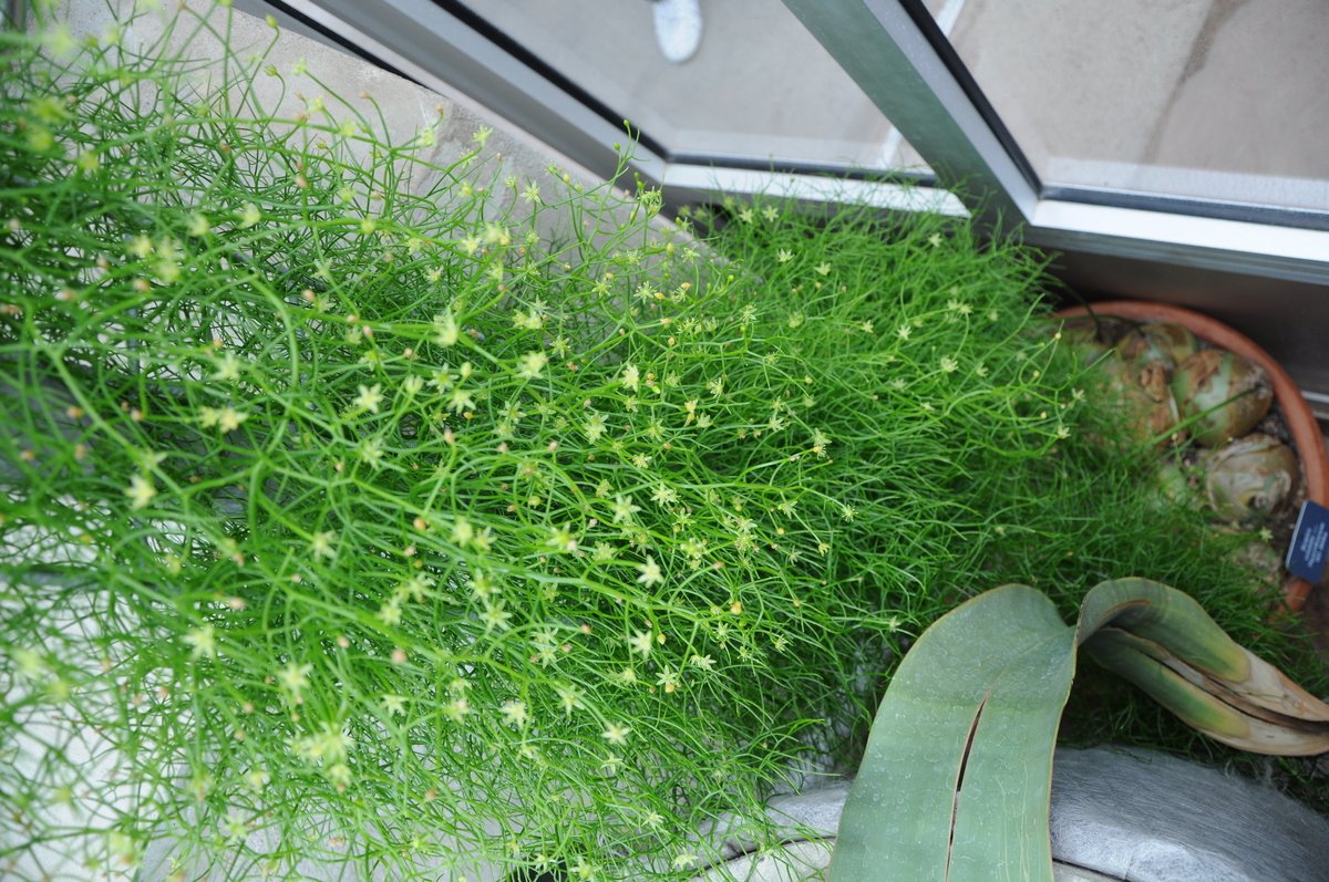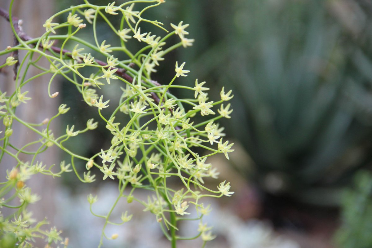 Бовиэя при всей красоте своих веточек и луковицы отнюдь не теряет способности к цветению. На концах побегов распускаются трогательные звездочки цветков – не крупнее 1 см, необычные, беловато-салатовые, мясистые, они выглядят невзрачными даже вблизи, но все равно кажутся россыпью маленьких украшений.