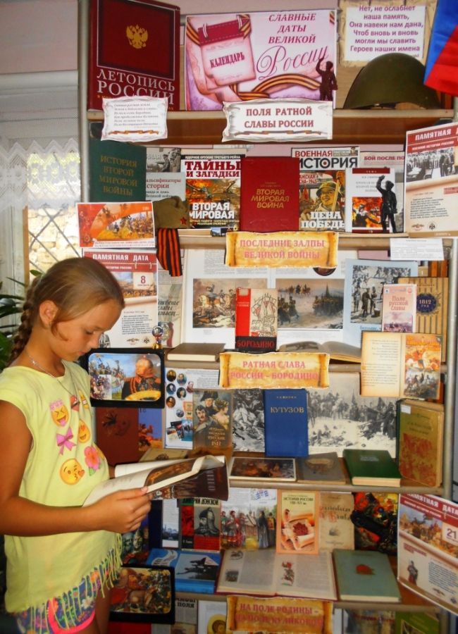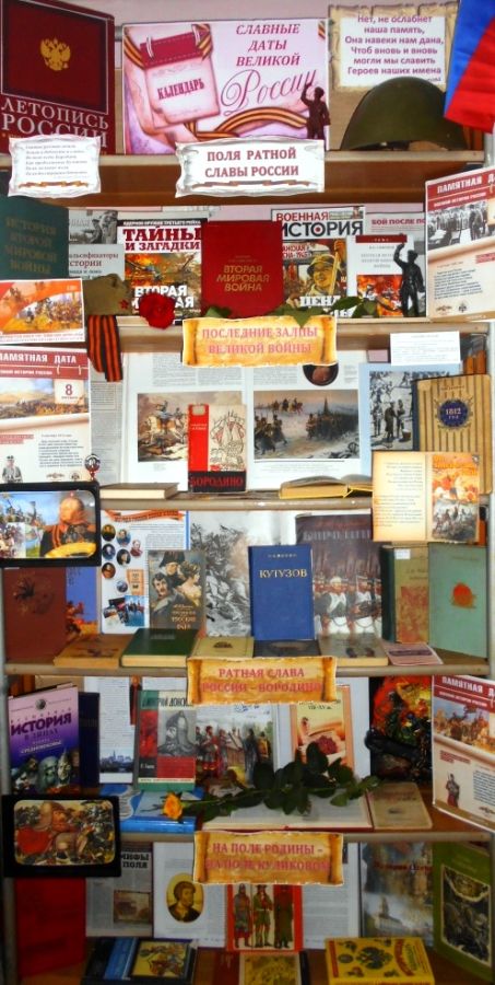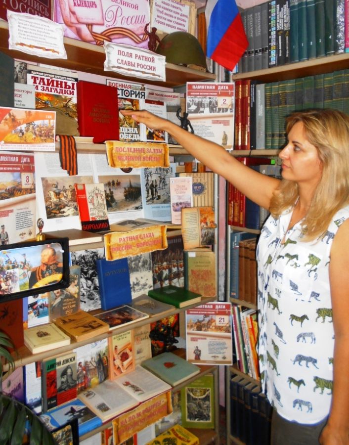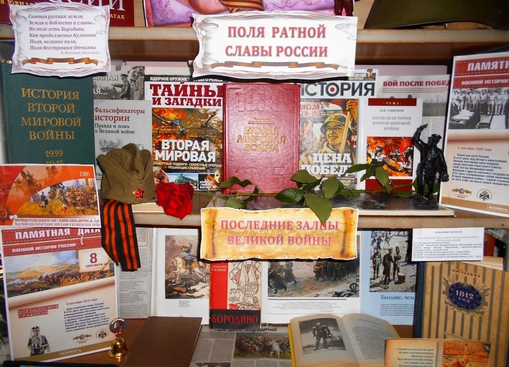 Эти строки из поэмы Владимира Молчанова стали эпиграфом выставки-гордости «Поля ратной Славы России» из цикла «Славные даты Великой России», обновленной в читальном зале библиотеки-филиала №4 им. М.М. Коцюбинского МБУК ЦБС для взрослых Симферополя при поддержке волонтеров. Выставка посвящена сентябрьским Дням воинской славы и Памятным датам военной истории России, победным сражениям, прошедшим на полях русской ратной доблести.