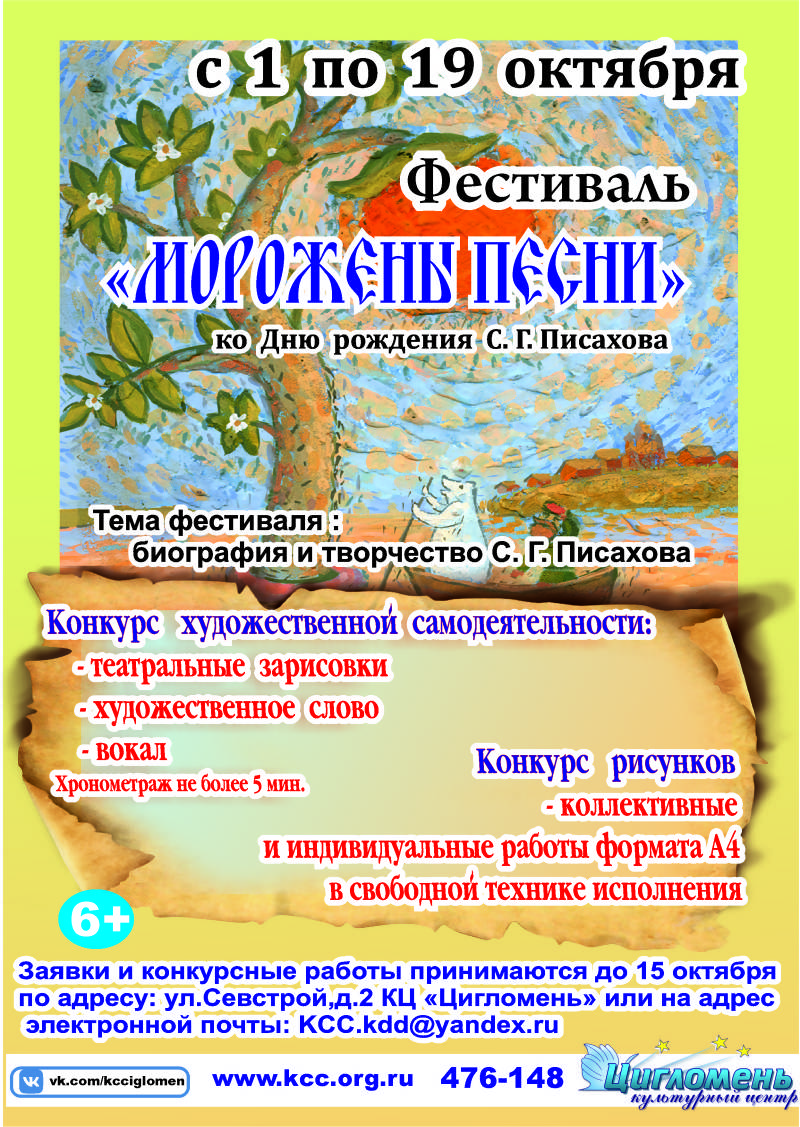 Итоги будут подведены после 19 октября. О дате проведения фестиваля всем участникам будет сообщено дополнительно. Все вопросы по тел. 476-128 (информационно-аналитический отдел) или 476-148 (администраторы культурного центра «Цигломень», с 9 до 21 ежедневно).