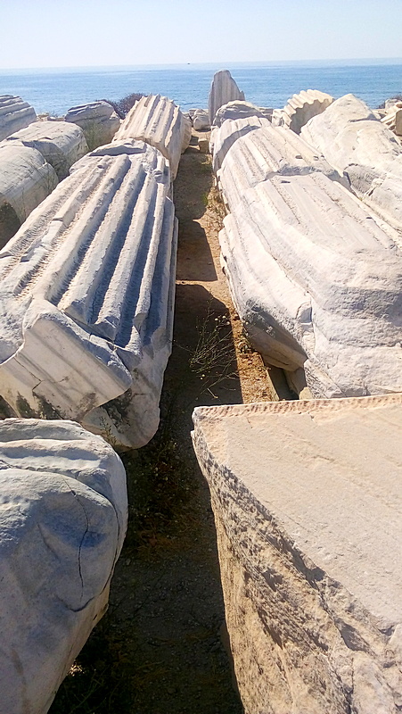 Иду по нескольким кварталам бутиков — торгуют всем. От восточных сладостей, кофе и сувениров до одежды и ковров. Но я сюда приехал не за этим. Терпеливо иду. И за очередным поворотом — море. Выхожу к античной гавани и снова уношусь на пару тысячелетий назад. Величественные колонны, банный комплекс… А почти на самом берегу фрагменты разрушенных колонн уложены чуть ли не штабелями — иного применения им пока не нашлось…