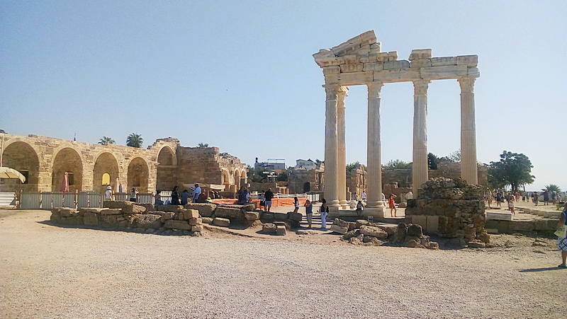 В первый же полный день своего пребывания в Сиде, после моря, хамама, обильного ужина я отправился прогуляться в античную часть города. Доехал без приключений и проблем, спросил на конечной остановке, куда именно идти. Благо дело, русскоязычных туристов в городе очень много (приезжают даже с грудными младенцами), хотя, как сообщили мне в турфирме, Сиде для россиян открыли только в 2017 г. Но турки очень быстро подстроились — даже в банкоматах есть меню на русском, а снять деньги с Визы или МастерКарт можно в любой валюте по курсу банка (карты «Мир» там не действуют!). Да и договориться с продавцами-полиглотами не составляет труда.