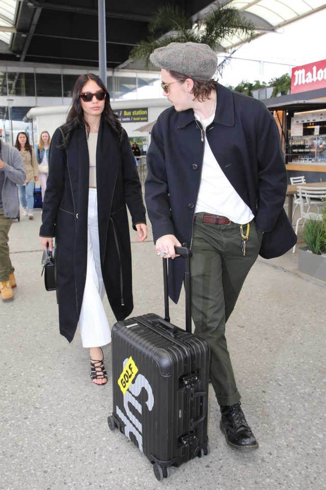 Сегодня пару сфотографировали в аэропорту Ниццы: Хана для полета выбрала белые брюки, бежевый топ и черное пальто. А еще она, кстати, покрасилась в черный! Ждем их на фестивале.
