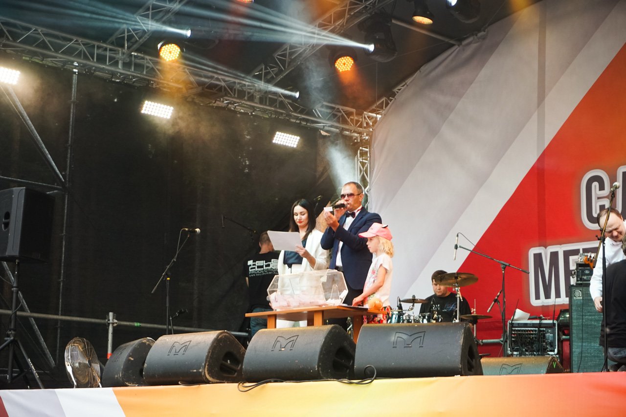 Сцену в этом году поставили не у ДК, а напротив, за фонтаном. Чтобы всем было видно, фонтан частично разобрали, сняв верхнюю чашу. А также по бокам смонтировали экраны, куда непрерывно транслировали все, что происходит на сцене и в зале.