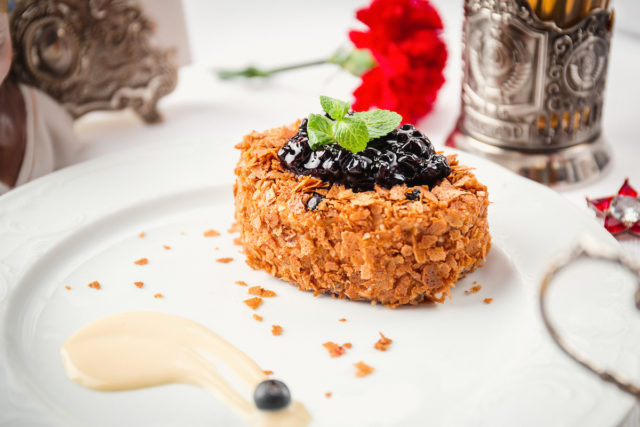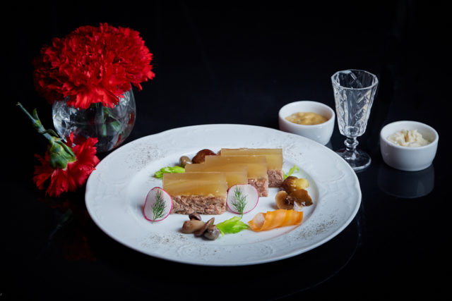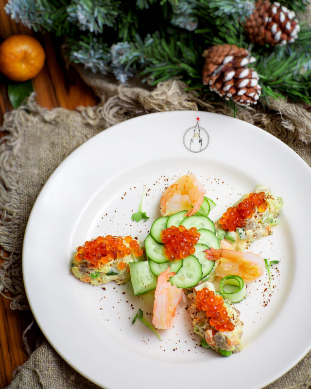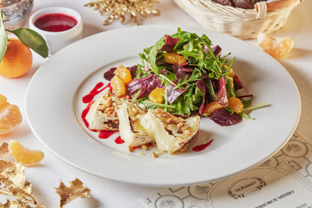 До 15 января 2020 здесь можно попробовать утиную ножку с грушей и свекольным пюре (1300 р.), жульен с курицей (480 р.) или жульен из снежного краба (680 р.). И, конечно, классика: селедка под шубой (450 р.), пикантный салат Оливье (750 р.) в авторском исполнении со вкусом креветок и красной икры или холодец из томленой говядины (490 р.).
