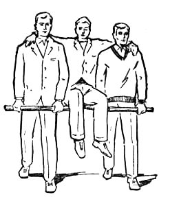 Толстая палка длиной в два метра продевается в лямки двух рюкзаков и хорошенько фиксируется. Два носильщика надевают рюкзаки, а пострадавший садится на поперечную палку, удерживаясь за плечи товарищей. Вместо палки можно использовать длинную, несколько раз сложенную верёвку. Нагрузка равномерно распределяется на спины, что позволяет идти довольно долго. Минусы - крайне сложно скоординировать движение по пересечённой местности, рост носильщиков должен быть примерно равным. Очень сложно двигаться по узкой дороге. Подходит для транспортировки больных лёгкой и средней тяжести (второе - только в крайнем случае).
