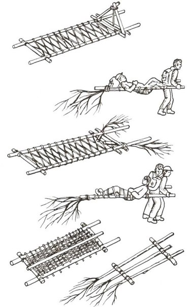 - берутся две длинные жерди и множество коротких палок, которые будет служить поперечинами. Всё это собирается в подобие лестницы. Даёт жёсткую и прочную опору, идеальную для переноски пострадавших с травмами позвоночника.