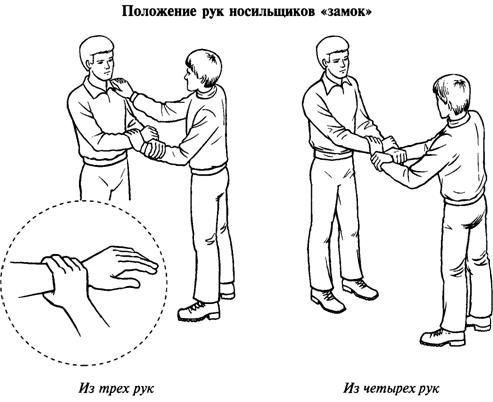 Требуется 2 человека. Один фиксирует свою правую руку на своём же левом запястье, а левую руку фиксирует на правом запястье второго. Способ крайне простой, на коротких расстояния работает отлично. Можно идти по пересечённой местности, подниматься по лестнице и вообще, потерпевший находится в весьма удобном положении. Минусы - носильщики должны быть приблизительно одного роста и обладать отличной физической подготовкой. Очень устают руки. Неудобно идти по узким тропкам. Словом, подходит для переноски пострадавших лёгкой степени тяжести.
