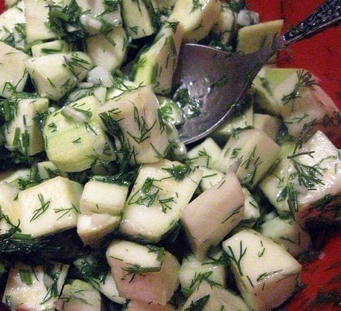 Укроп порезать, чеснок почистить и порубить ножом. Всё смешать и оставить часа на 3 мариноваться при комнатной температуре.