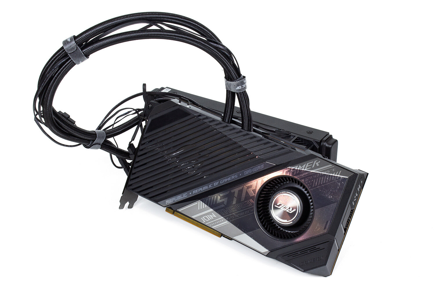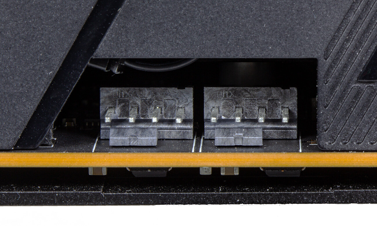Примечательно, что к видеокарте можно подключить ещё два вентилятора (корпусных), которые будут управляться «мозгами» видеокарты в зависимости от температуры GPU. При полностью воздушном охлаждении эта стандартная для топовых плат ROG более актуальна, чем с жидкостно-воздушным, но все равно называть её бесполезной будет опрометчиво. Подключить к этим разъемам один или два «вытяжных» вентилятора будет хорошей идеей. Они отлично дополнят два штатных вентилятора на радиаторе, которые (чаще всего) устанавливают на вдув на лицевой стороне корпуса.
