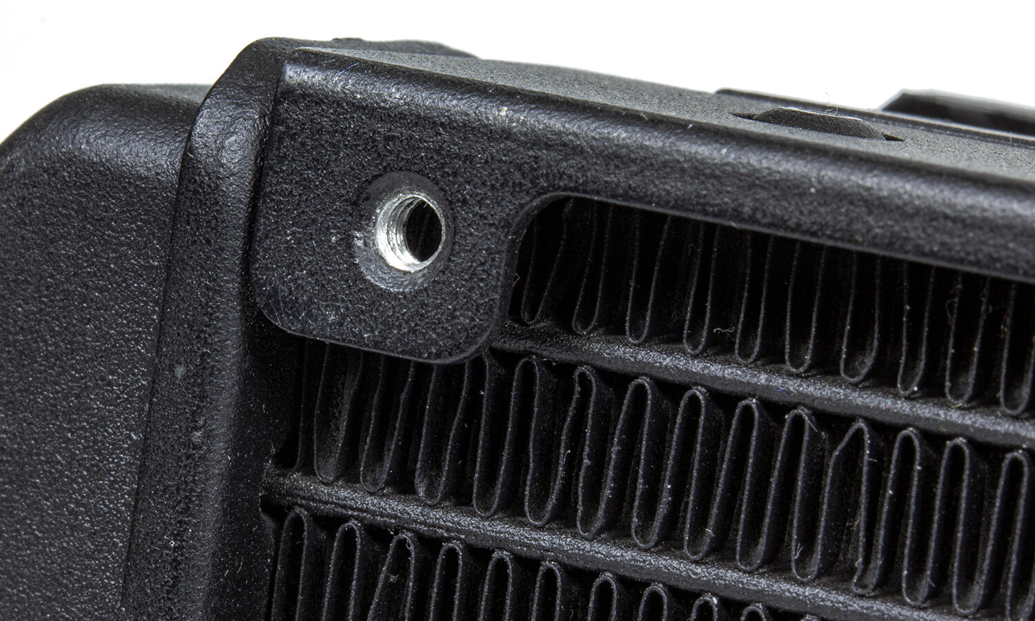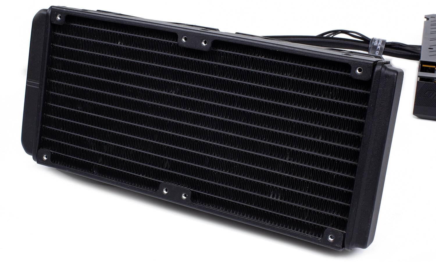 Типоразмер радиатора 240 мм, ребра выполнены из алюминиевой полосы толщиной 0,2 мм. Толщина радиатора 28 мм, аэродинамическое сопротивление небольшое. Рядом с патрубками подключения шланга расположен порт заправки. Шланги на патрубках крепят металлические гильзы, соединение неразъемное (точнее, после отключения придется искать новые гильзы и инструмент для установки).