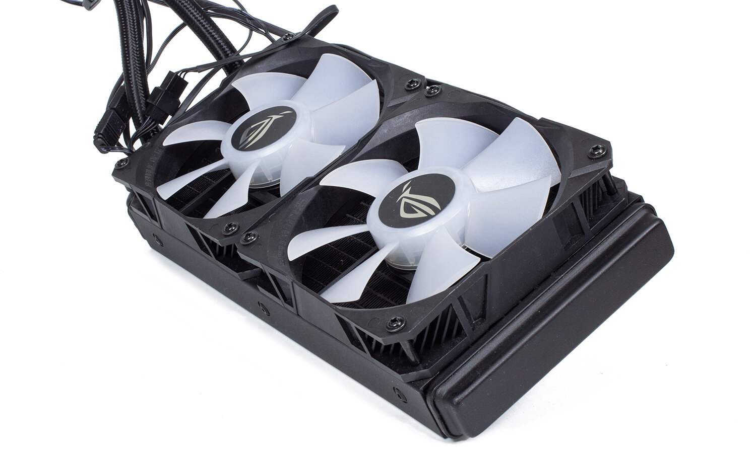 Вентиляторы фирменные, ROG Ryuo fan Model 12 RGB, типоразмер 120 мм, максимальная скорость вращения 2500 оборотов в минуту.