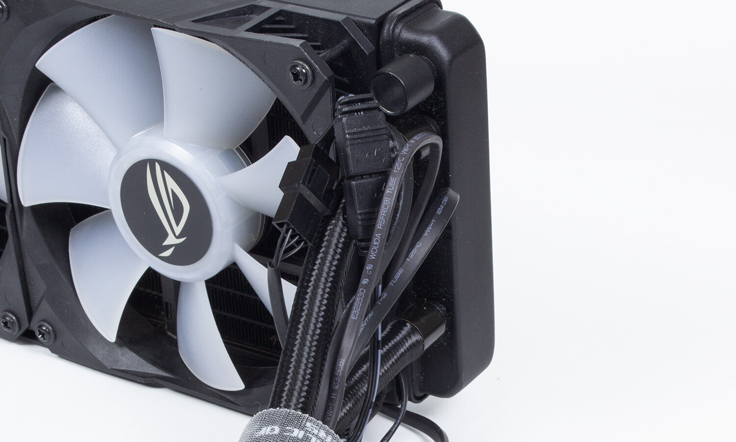 К радиатору тянется пара шлангов и провода для функционирования вентиляторов. Шланги жестковатые, в матерчатой оплетке. Предположу, что внутренний диаметр у них 5,5 мм, толщина стенки около 2,5 мм. Хорошее решение для подобных СЖО, так как сочетают сравнительно высокую прочность и долго сопротивляются «схлопыванию» при перегибах и перепадах давления. То есть отпадает необходимость использовать какую-либо внешнюю защиту от перегиба. Длина шлангов около 550 мм, что позволяет без проблем укрепить радиатор как на верхней, так и на фронтальной стенке большинства корпусов.