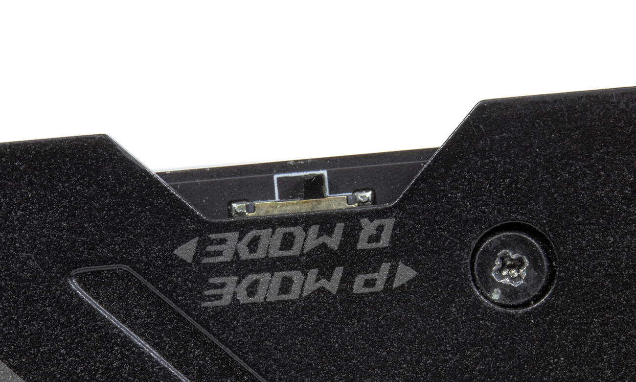 Никуда не делся и хорошо знакомый переключатель профиля работы системы охлаждения: P Mode немного увеличивает скорость вращения вентиляторов, снижая температуру графического процессора, Q Mode позволяет нагреться GPU чуть сильнее, снижая скорость вращения крыльчаток в угоду акустическому комфорту.