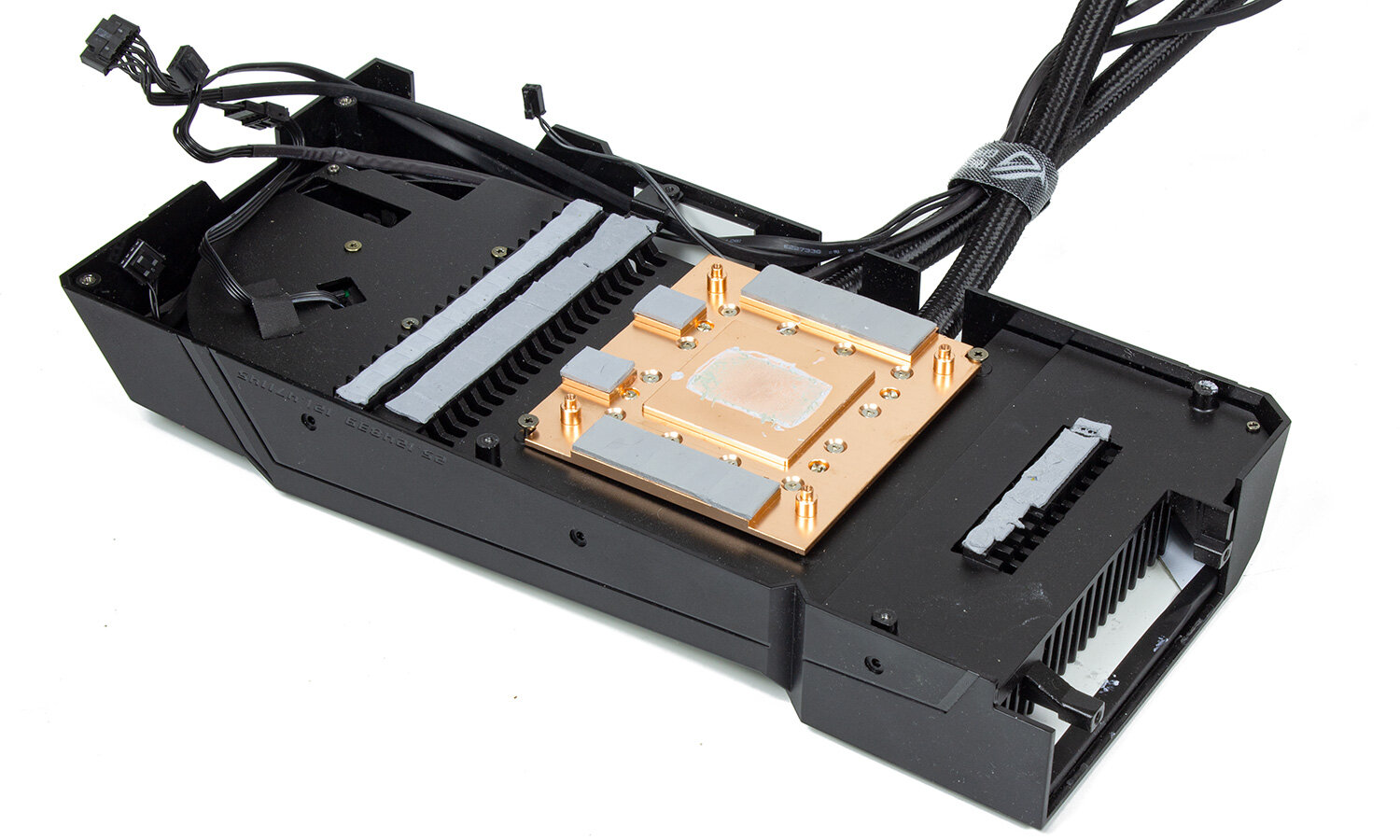 Печатная плата закреплена на радиаторе десятью винтами. Строение соответствует предположению: по центру ватерблок, охлаждающий графический процессор. Вокруг него элементы алюминиевой рамы, которая и отводит тепло от силовых ключей и видеопамяти, и играет роль жесткого каркаса, снимая с текстолита большую часть механических нагрузок.