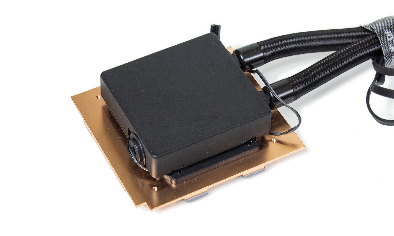Ватерблок и помпа объединены в одном небольшом блоке, также оснащенном портом для заправки хладагентом. Вывод патрубков с торца пластиковой крышки ватерблока, помпа подключается отдельным шнуром непосредственно к разъему на плате.