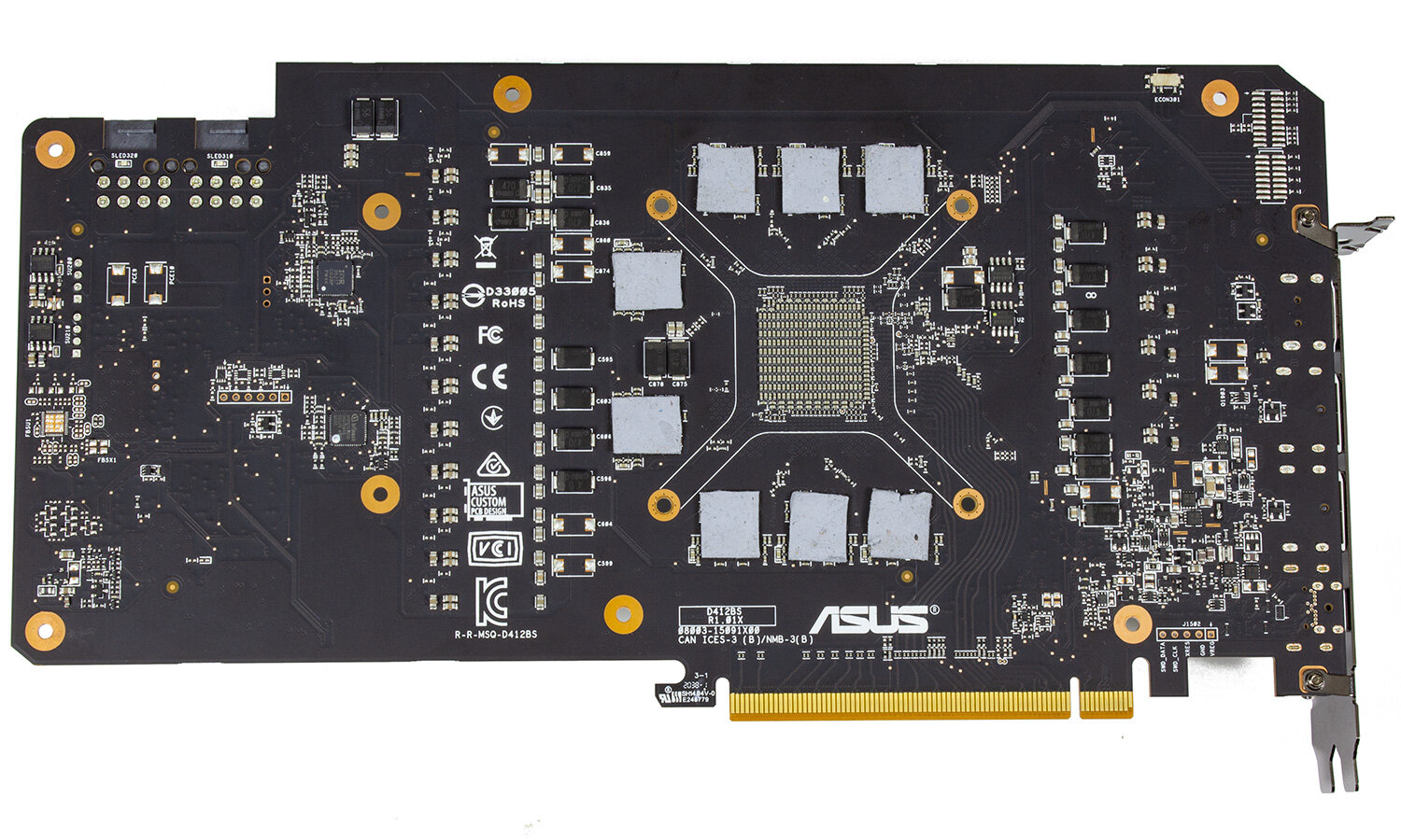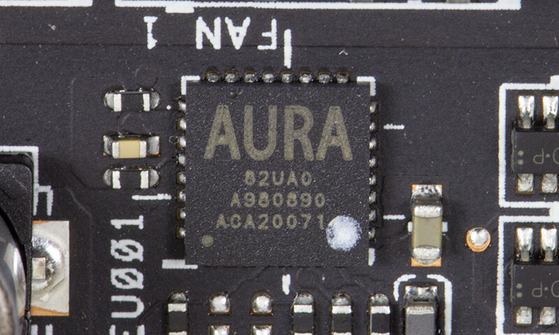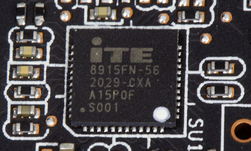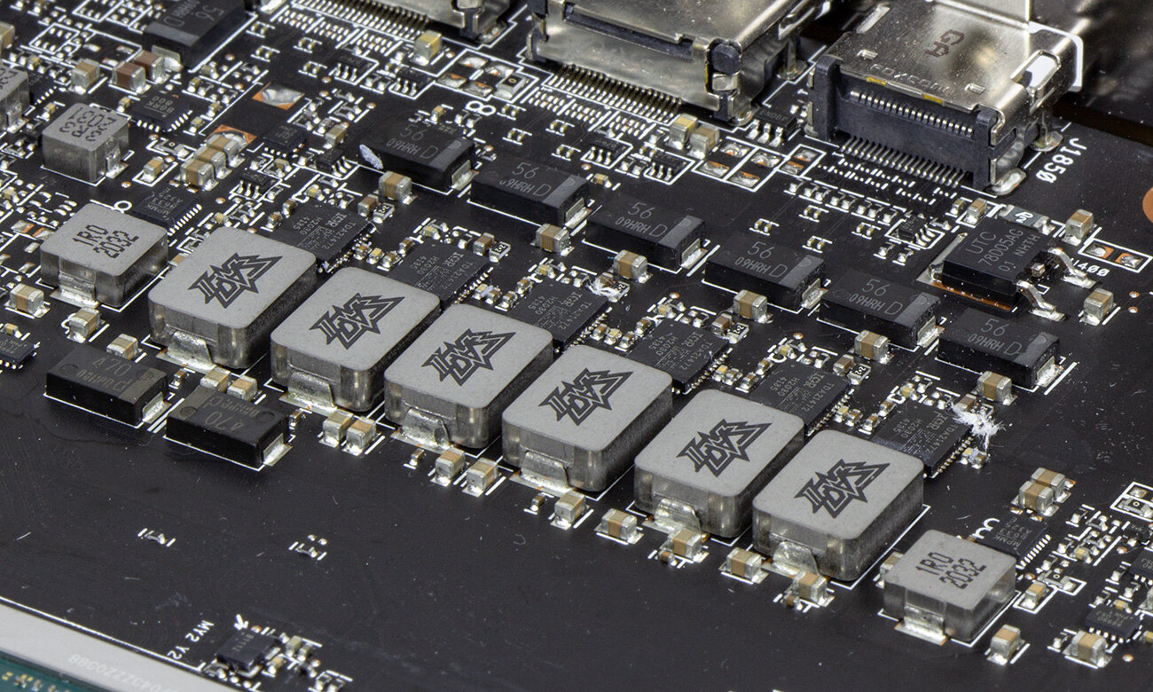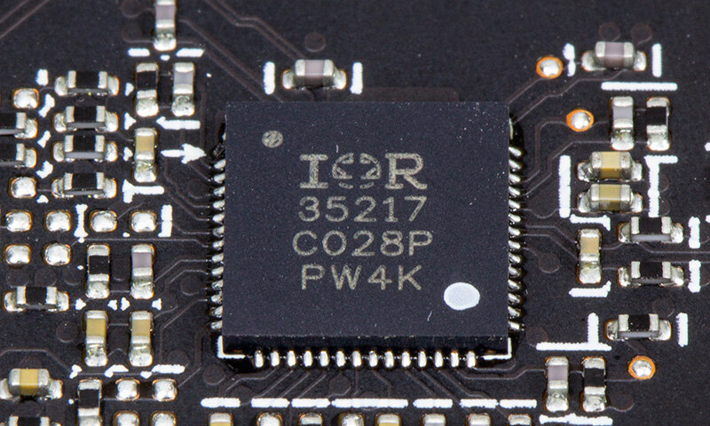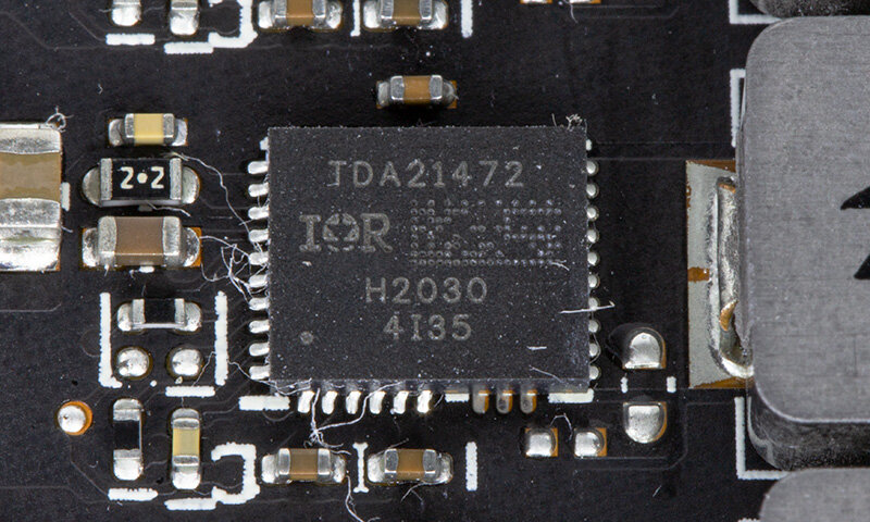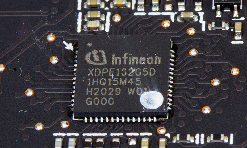 В качестве силовых ключей используются сборки Infineon TDA21472.14-фазный преобразователь управляется контроллером Infineon XDPE132G5D, трехфазный (для видеопамяти) — Rectifier IR35217. Многоцветовой RGB-подсветкой управляет контроллер с подписью AURA, а вентиляторами — микросхема ITE8915FN.