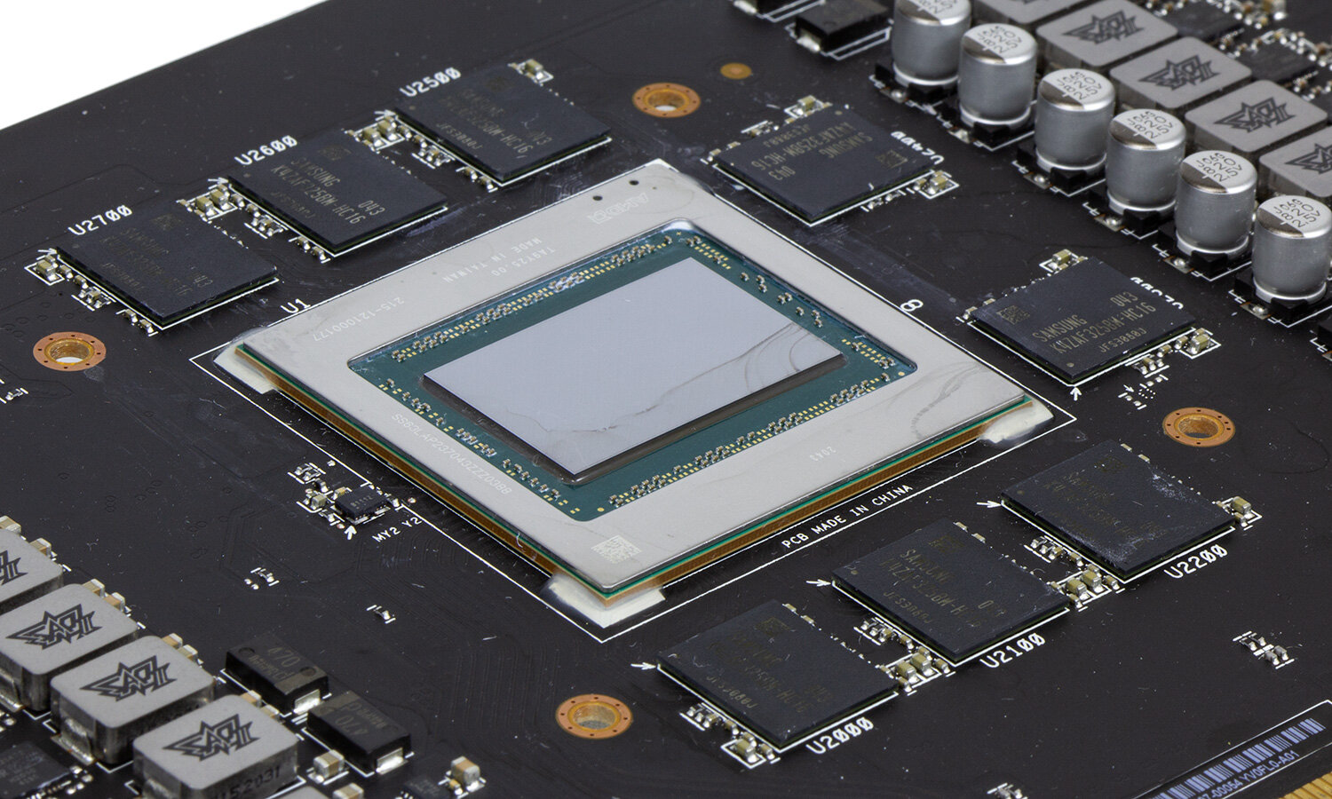 Печатная плата и расположение элементов на ней полностью аналогично той, что установлена в рассмотренной ранее TUF Radeon RX 6800 XT OC. Строение классическое: графический процессор примерно по центру платы, вокруг микросхемы видеопамяти, слева и справа преобразователи питания для GPU и VRAM. Разъемов питания два, оба восьмиконтактные. Под ними компоненты управления вентиляторами и подсветкой. На обратной стороне видеокарты размещены контроллеры преобразователей.