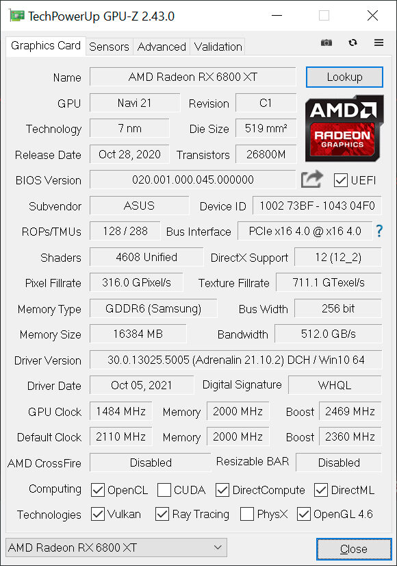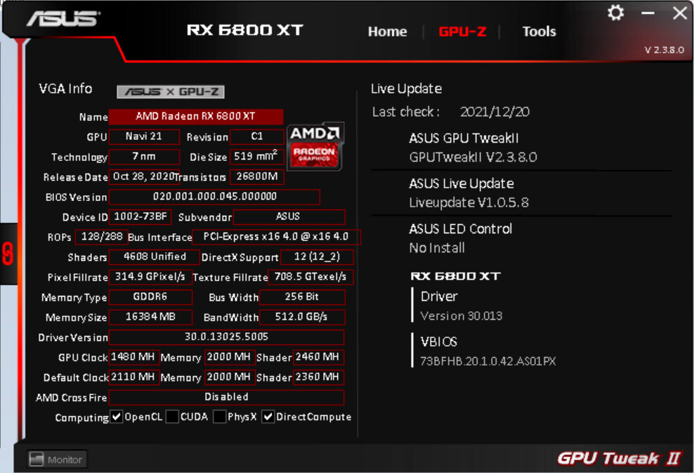 Частота графического процессора под нагрузкой варьируется от 2110 до 2527 МГц (на «воздушной» TUF-версии 6800XT было 2489 МГц), частота памяти — 2000 (16000) МГц.