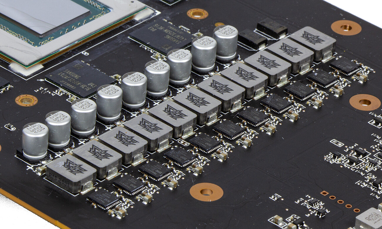 На плате распаян процессор NAVI 21 с 4608 универсальными процессорами, 288 текстурными блоками и 128 ROP. К нему по 256-битной шине подключены 16 Гбайт видеопамяти типа GDDR6 производства Samsung.