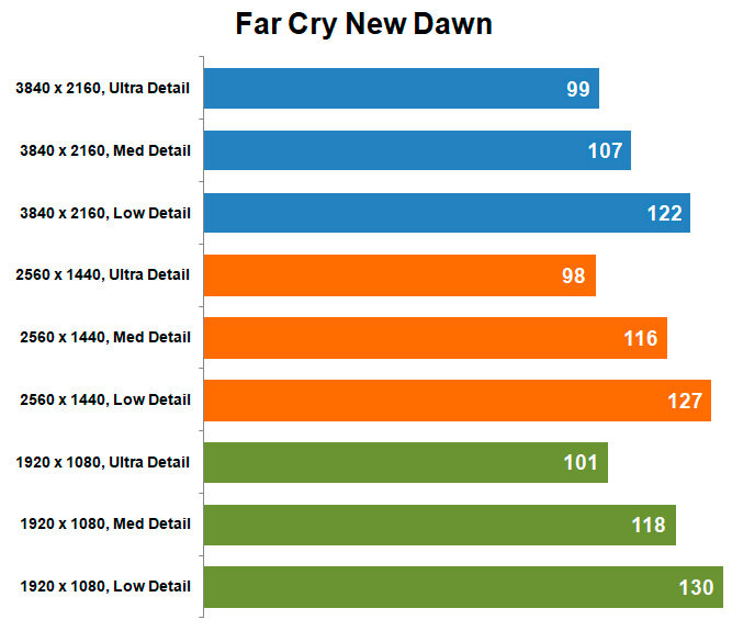 Far Cry New Dawn в данном случае показал результаты, слабо зависящие от процессора. Во всех трех разрешениях — от 100 до 130 кадров в зависимости от настроек. Даже комментировать особо нечего: плавно, без тормозов, хороший рефреш.