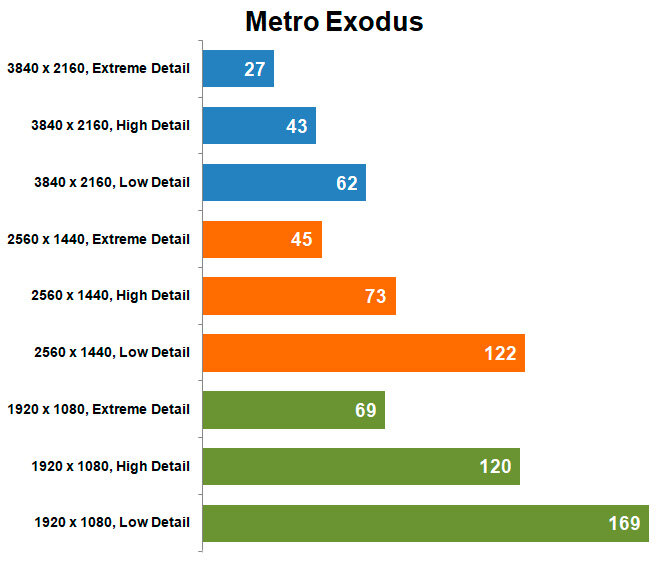 Metro Exodus — все ещё красиво, детализировано, но очень медленно на пресете Extreme, с DLSS, Ray Tracing и тесселяцией. Отсюда результат в 27 кадров в 4K и 45 в QHD. Отключаем перечисленные дополнительные опции — и сразу полуторакратный скачок, картинка поменялась незначительно (если не знать, куда смотреть), и комфорта в геймплее сильно поприбавилось. Лучше всего выбрать разрешение Full HD, которое не накладывает столько ограничений на «улучшения» картинки, особенно если вы проходите игру вдумчиво и неторопливо.