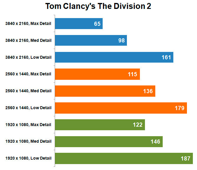 Division 2 демонстрирует хорошие показатели в QHD и Full HD, а в 4K можно свободно играть на пресетах Med и Low. Пресет Max изобилует мелкими подтормаживаниями при серьезных перестрелках с большим числом врагов.