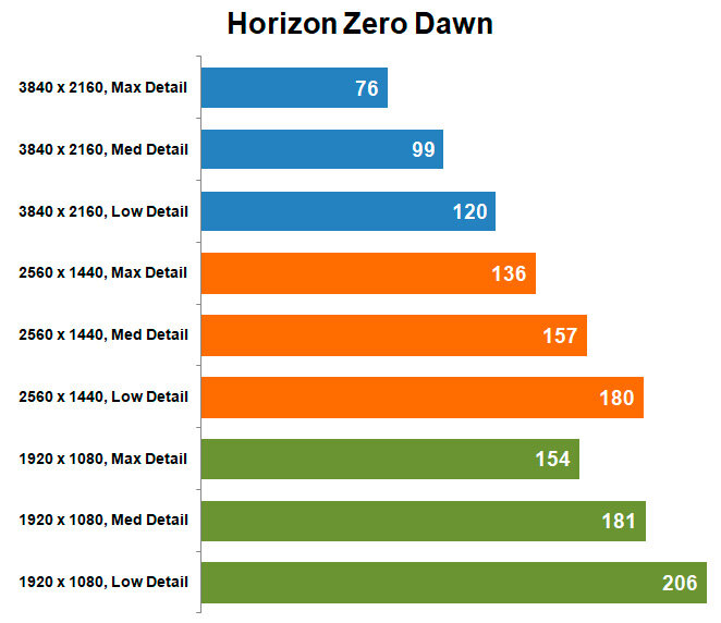 Horizon Zero Dawn идет с мелкими и редкими фризами лишь в 4K на пресетах Max и Med, но они практически незаметны по ходу игры. В остальном геймплей плавный, приятный.