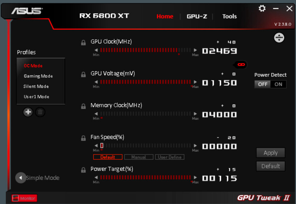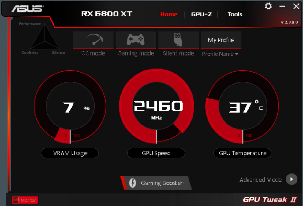 Для тонкой настройки, а также получения информации о состоянии видеокарты ASUS предлагает утилиту GPU Tweak II. Для неискушенного пользователя подготовлено три пресета: OC Mode, Gaming Mode и Silent Mode, отличающийся частотами.