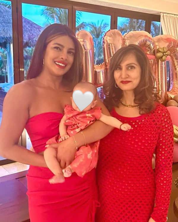 A picture has been going viral on Instagram, which has been shared by Priyanka Chopra's friend Tamanna Dutt. The first picture is a selfie of Priyanka with Tamanna. The second picture is from the birthday celebrations and the gorgeous actress is seen holding her little one while posing for a photo. Of course, the face of Malti Marie Chopra Jonas has been hidden. But we still get a glimpse of the munchkin. She is seen in a salmon-coloured dress. Her cute chubby cheeks are visible too. On the other hand, Priyanka Chopra is seen in a strapless red dress. The third picture is of Tamanna, her child and PeeCee on a trip. Check out the picture here:
