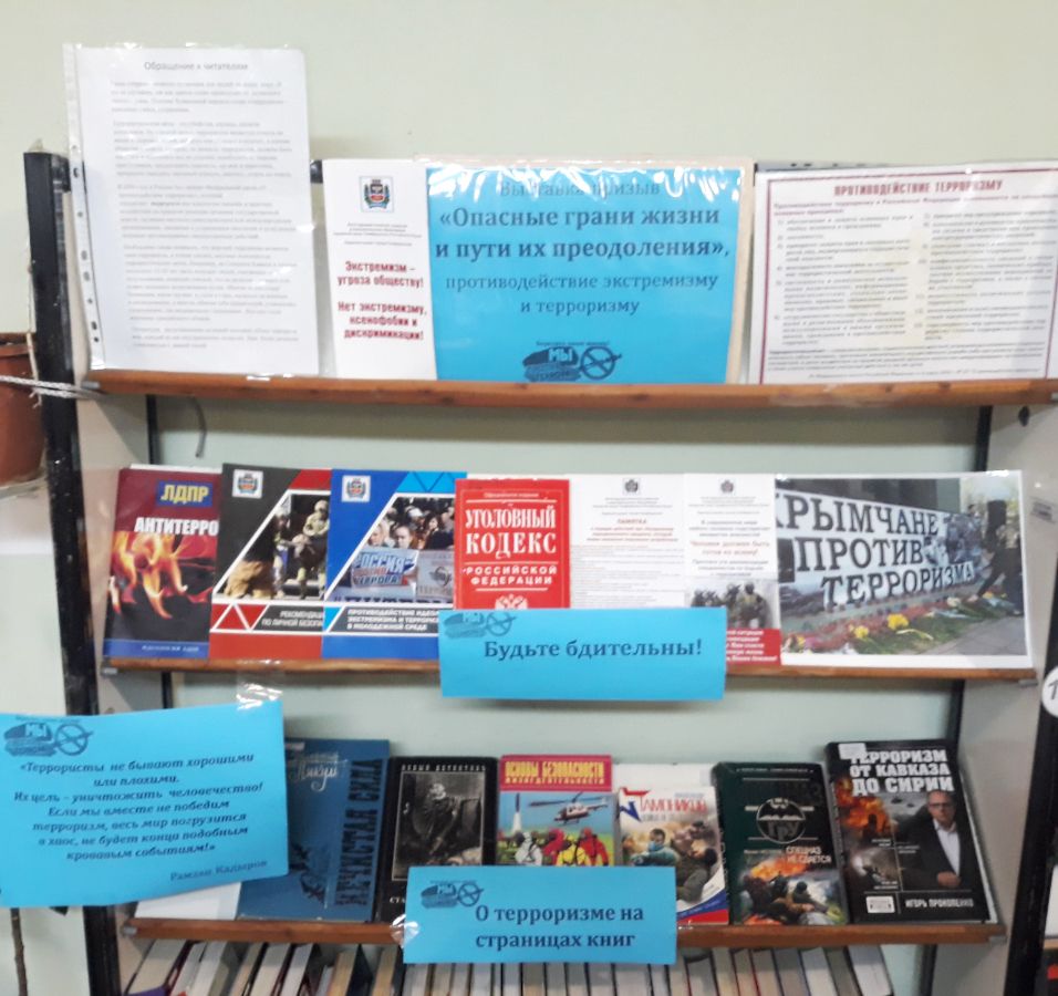 Для посетителей симферопольской библиотеки-филиала №7 им. Т. Г. Шевченко открылась выставка-призыв в противодействии экстремизму и терроризму «Опасные грани жизни и пути их преодоления». Рубрика «Будьте бдительны!» знакомит читателя с ответственностью, которая неизбежно наступает за совершение преступления террористической и экстремистской направленности. Читатели познакомятся с рекомендациями специалистов по борьбе с терроризмом, прочтут памятки по личной безопасности и порядка действий, если вас захватили в заложники, а также о порядке действий при обнаружении подозрительного предмета.