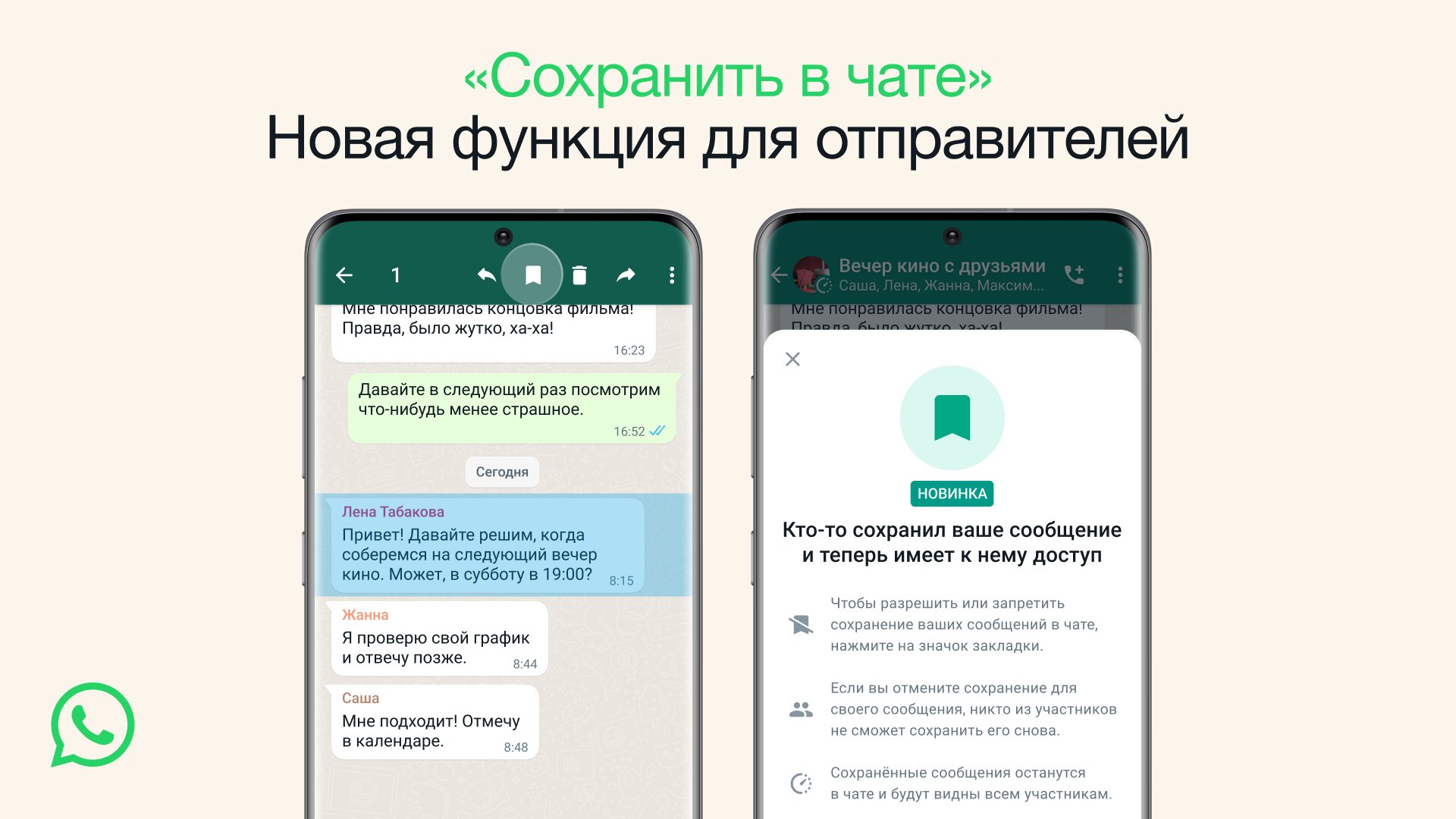 Функция «Сохранить в чате» реализована весьма продуманно: при её использовании отправитель сообщения получает уведомление, что тот или иной участник чата сохранил запись. При желании автор может отменить это действие (запрет будет установлен сразу для всех участников чата), и сообщение удалится по истечении таймера. Таким образом, отправитель получает полный контроль над тем, что произойдёт с его текстом или медиафайлом.