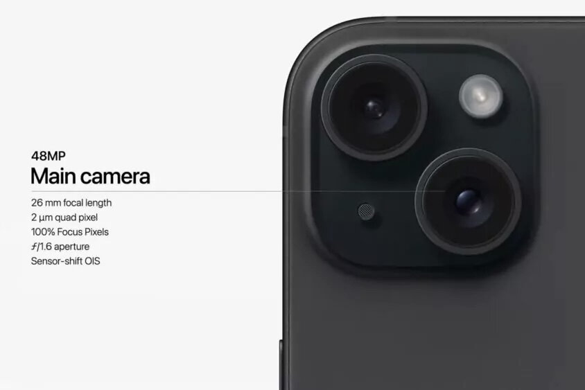 iPhone 15 и iPhone 15 Plus сохранили систему двойной камеры без телеобъектива. Основной широкоугольный датчик получил повышенное разрешение 48 Мп (было 12 Мп). Фокусное расстояние составляет 26 мм, размер пикселя 2 мкм, светосила некритично уменьшилась до f/1.6 (было f/1.5), стабилизация работает путём сдвига матрицы. Ультраширокоугольный модуль остался 12-мегапиксельным с той же светосилой f/2.4, как и 12-мегапиксельная фронтальная камера. Среди прочего, появились технология обработки Smart HDR 5-го поколения и вариант оптического приближения 2× в видоискателе камеры.