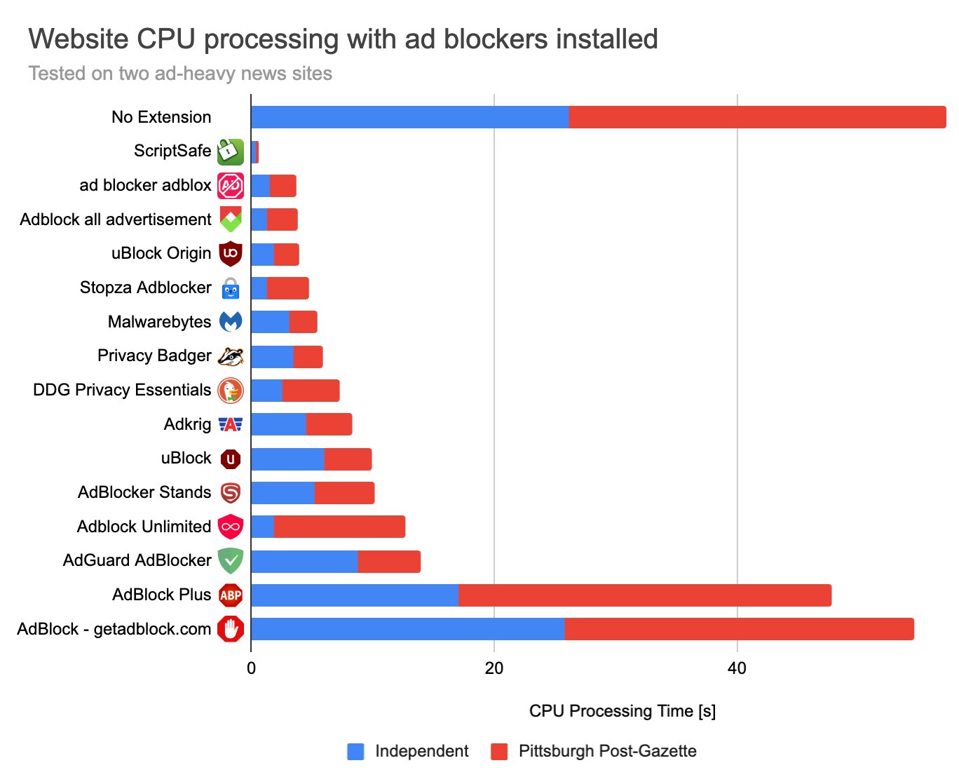 Для тестирования расширений разработчики открывали одни и те же новостные страницы (изданий Independent и Pittsburgh Post-Gazette). В обоих случаях у чистого веб-обозревателя без дополнений ушло 57 секунд процессорного времени (CPU processing). А вот тот же uBlock Origin, для сравнения, снизил это время до менее чем 4 секунд.