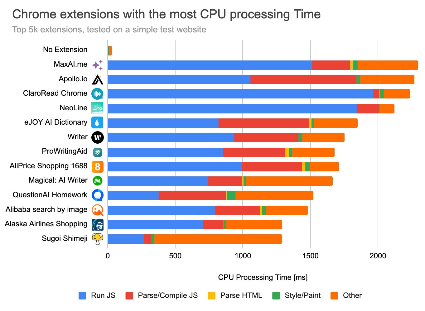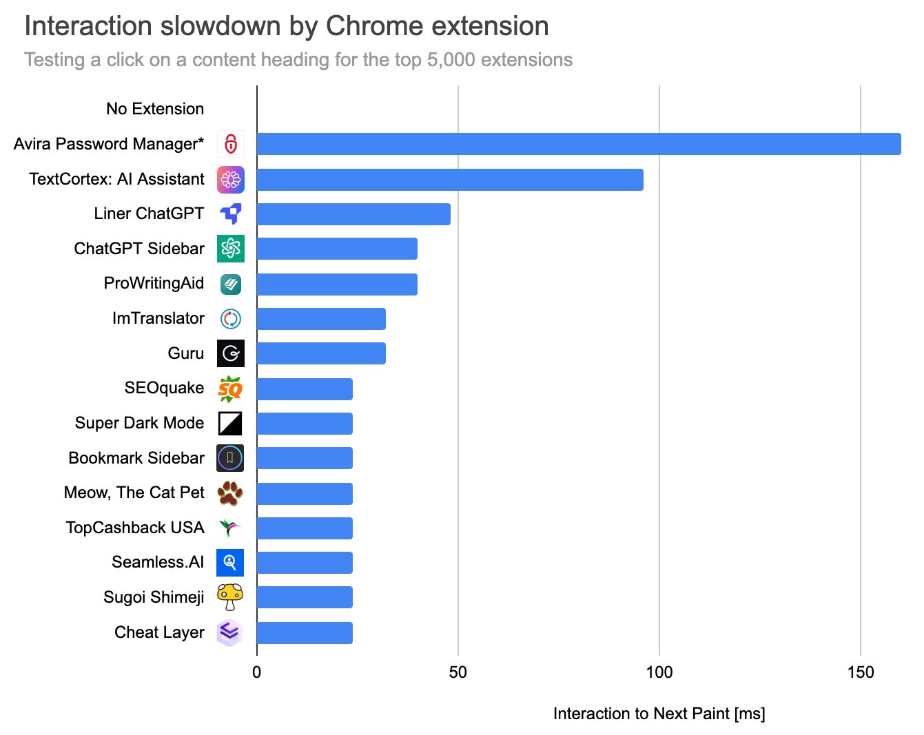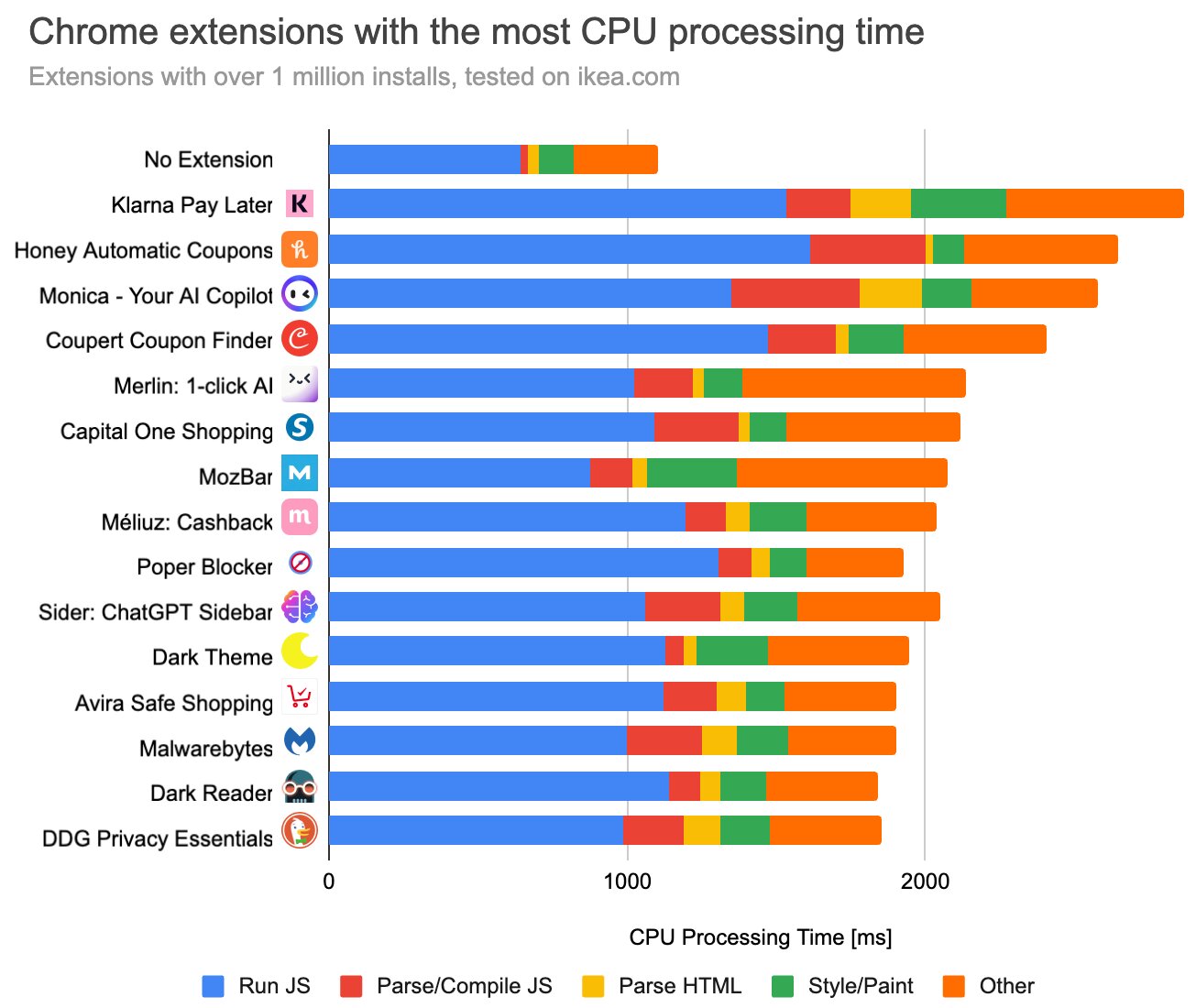 Разработчики из DebugBear протестировали 5 000 самых популярных расширений для Chrome, чтобы понять, как они влияют на работу браузера. В рамках эксперимента специалисты использовали разные метрики оценки влияния, в том числе нагрузку на процессор и скорость загрузки страниц.