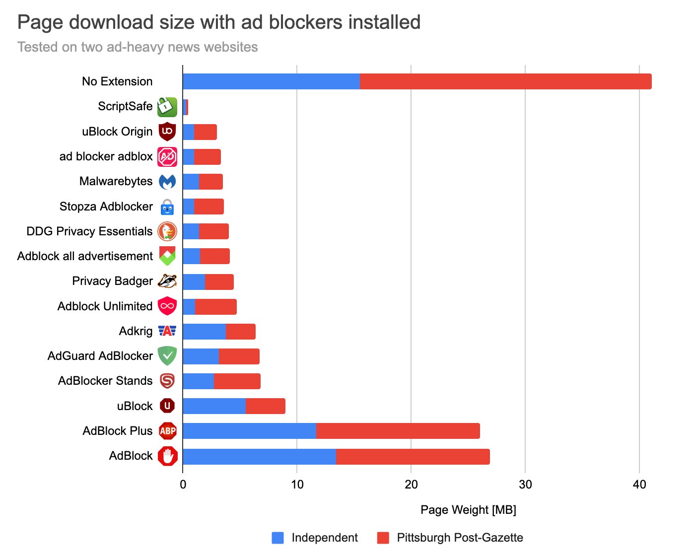 Впрочем, если рассматривать исключительно блокировщики рекламы, то они, наоборот, ускоряют загрузку страниц и снижают нагрузку на процессор — к примеру, некоторые из них снизили время обработки (CPU processing) с более чем 50 секунд до нескольких. Это объясняется тем, что в процессе загрузки расширения удаляют часть кода, который браузеру не нужно загружать — так, большинство блокировщиков снизили вес страницы с более чем 40 МБ до 5 МБ.