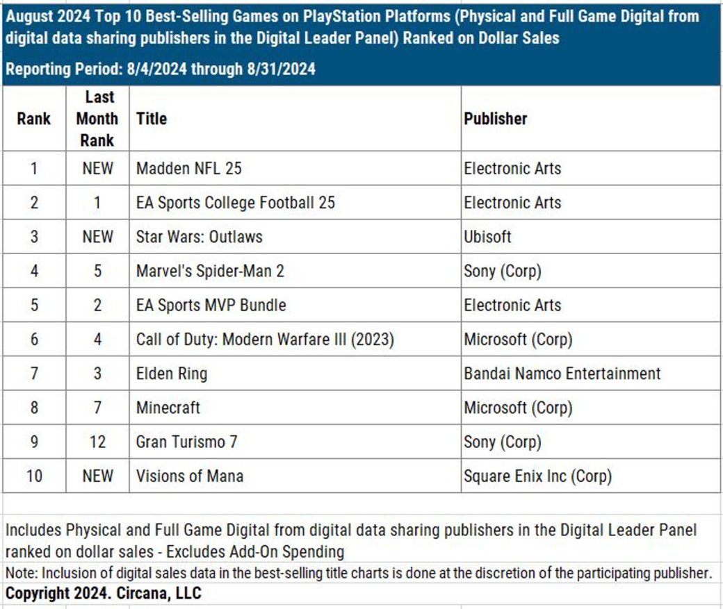 На PlayStation и Xbox первые места за август занимают те же игры, что и в общем чарте за месяц: Madden NFL 25, College Football 25 и Star Wars Outlaws.