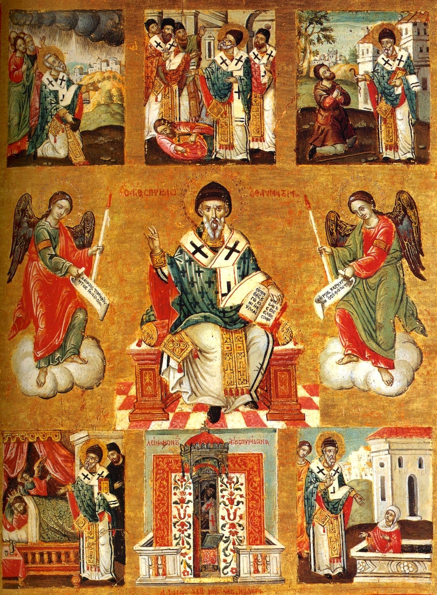 Святитель Спиридон жил на острове Кипр в конце III — середине IV века. Он был простым пастухом, отличался благочестивой и скромной жизнью, был женат и имел детей. Почти все свои средства раздавал нуждающимся и странникам. После смерти супруги его избрали епископом города Тримифунта. Несмотря на высокий сан, Спиридон сохранил прежнюю простоту и заботился о пастве с кротостью и любовью.