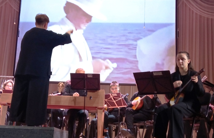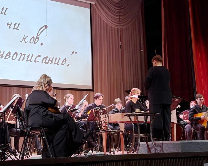 Поэму сопровождал оркестр, в котором играют студенты отделения народных инструментов, - руководитель и дирижер Татьяна Викулова. Бессмертную поэму сопровождала "Гоголь-сюита" Альфреда Шнитке. Тех, кто не раз слышал этот коллектив, не удивить - студенческий оркестр всегда на высоте. Несмотря на то, что обновляется постоянно, а значит, заново учится звучать, - планка настолько высока, что падать нельзя никак. У дирижера Татьяны Викуловой такой принцип.