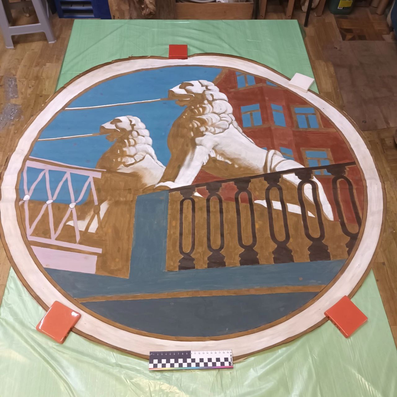 — Картоны нужны для переноса композиции на основу перед выкладкой смальты. Именно на нём заранее выстраиваются тональные переходы, ритм, масштаб элементов — он помогает понять, где, каким размером и каким цветом будет ложиться мозаика, — пояснили активисты, восстанавливающие панно.